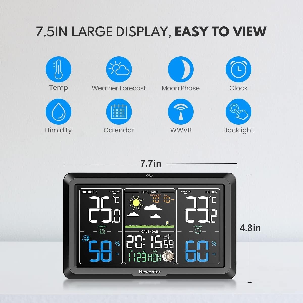 Atomic Weather Station Clock with WWVB Function: Seamlessly calibrates daily with WWVB (PST, MST, CST, EST) and auto DST function, offering easy access to an accurate clock and date. Manual settings are available for areas with weak WWVB signals.