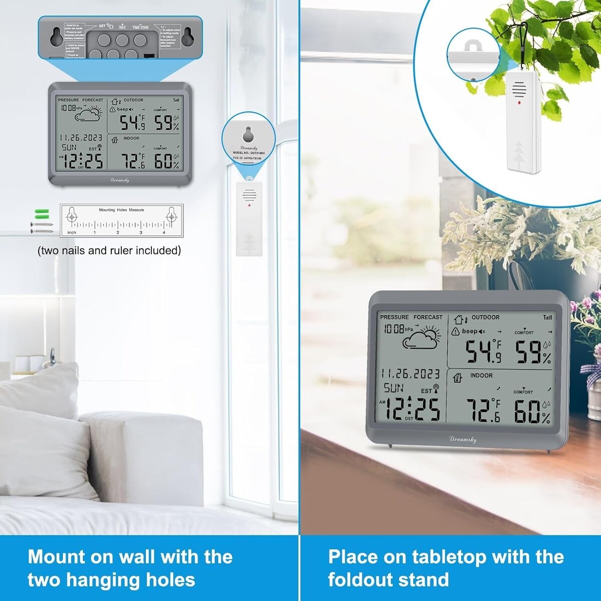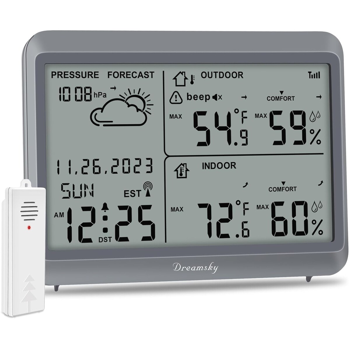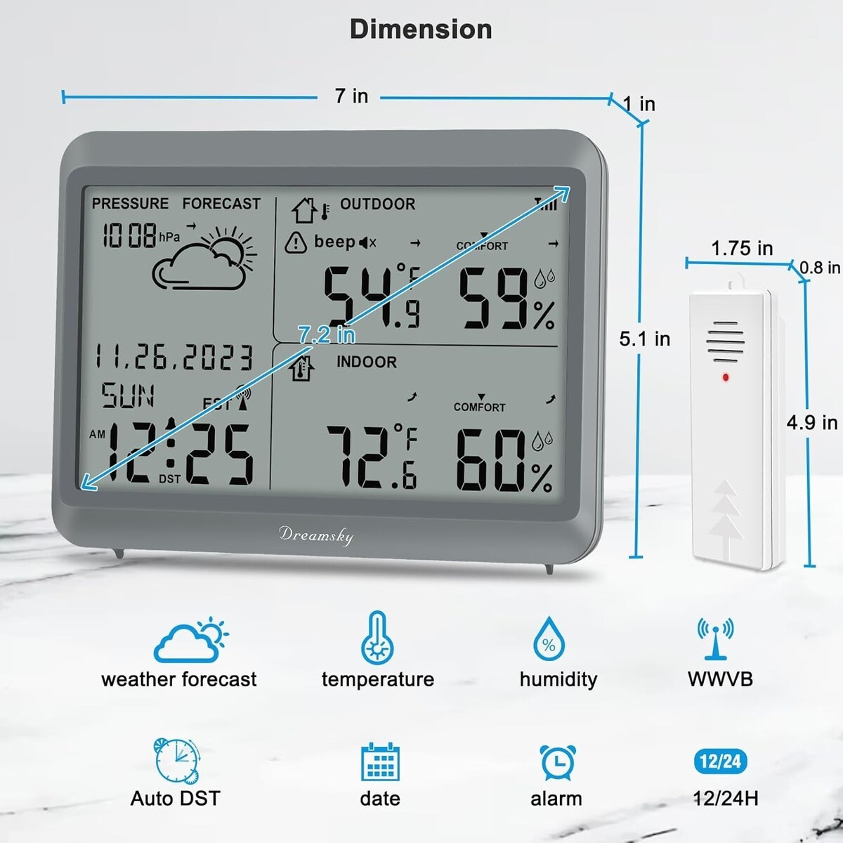 7.2 Inches Large Display: Enjoy effortless readability with a generous LCD screen that offers first-hand information about inside and outside temperature, humidity, and barometric pressure trends.