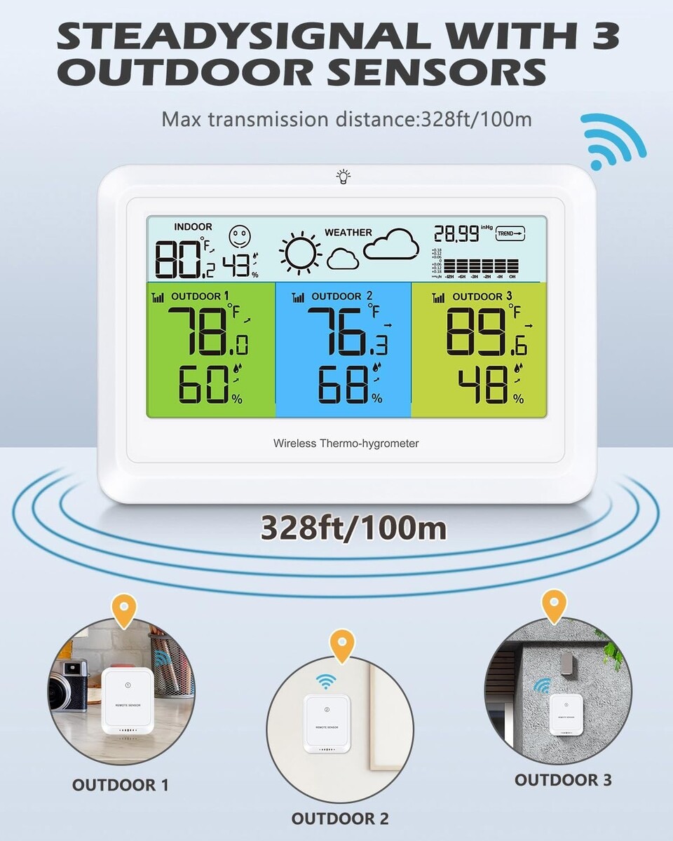 Effortlessly track multiple locations with three wireless sensor transmitters.