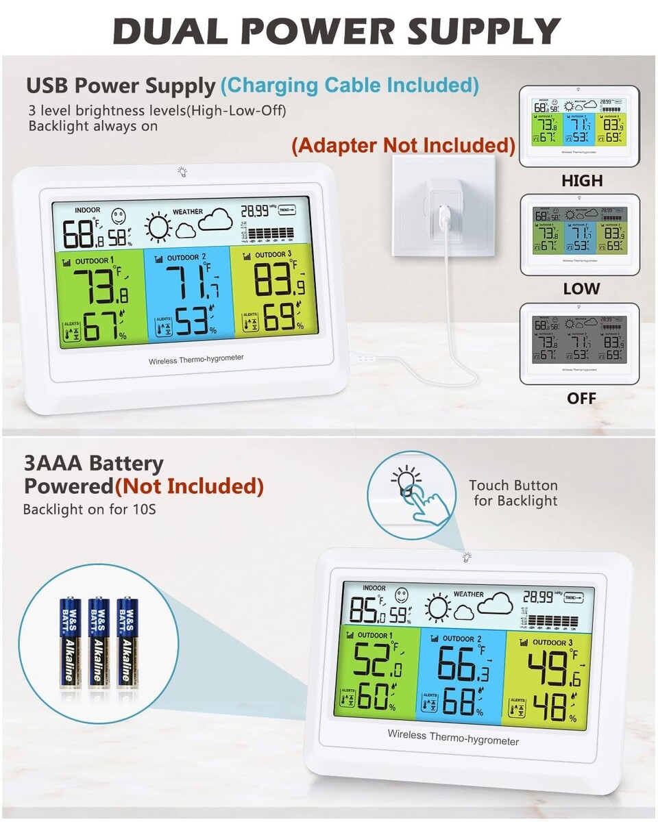 Features: Weather Forecast,Wireless,Indoor/Outdoor Monitoring,Real-time Data Display,Color-coded Modules,Max/Min Record,Temperature Alert,Backlight,Auto-recording,USB powered,Battery operated