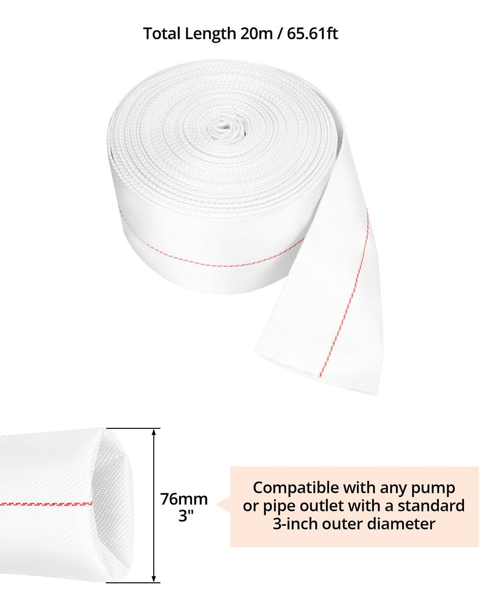 Size: 3" ID x 65 FT Length,wide and long enough to meet your drainage project.,Convenient: The hose is lightweight, removable, foldable, easy to use and carry.,Material: Outer layer is made of premium polyester yarn with high toughness. And PU coating on the inner wall, no wrinkles, not easy unglued, effectively ensure smooth water flow.,Application: Suitable for pool discharge, vehicle cleaning, garden watering, farmland irrigation, shallow well pump drainage etc.