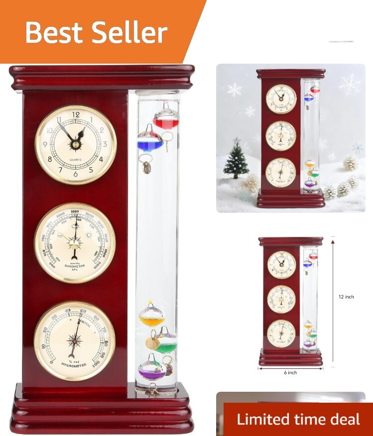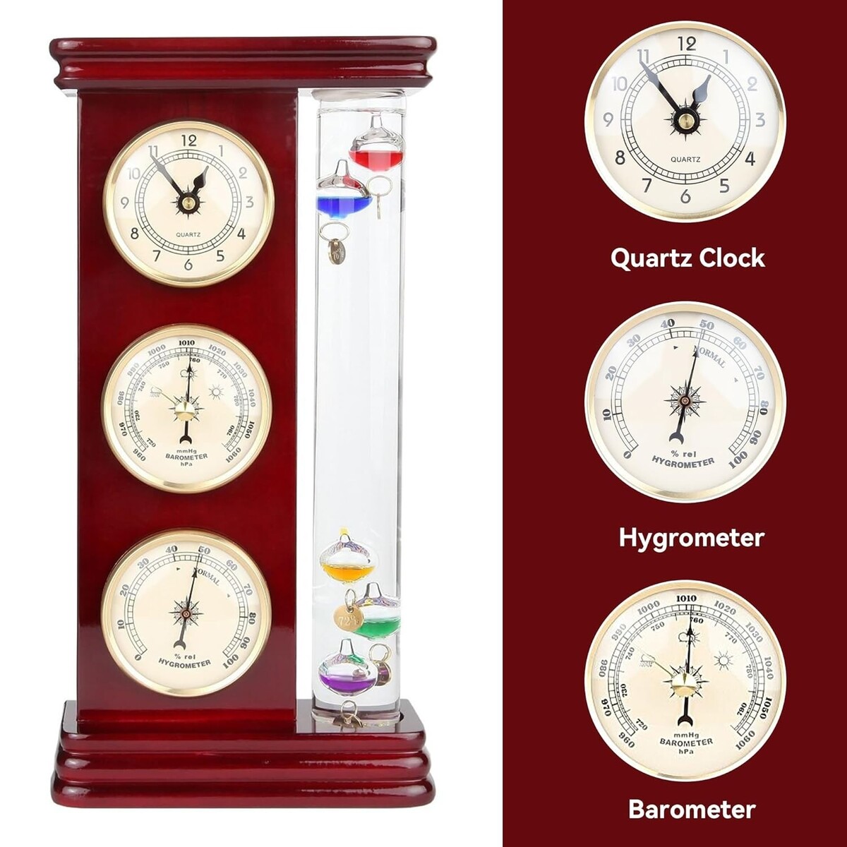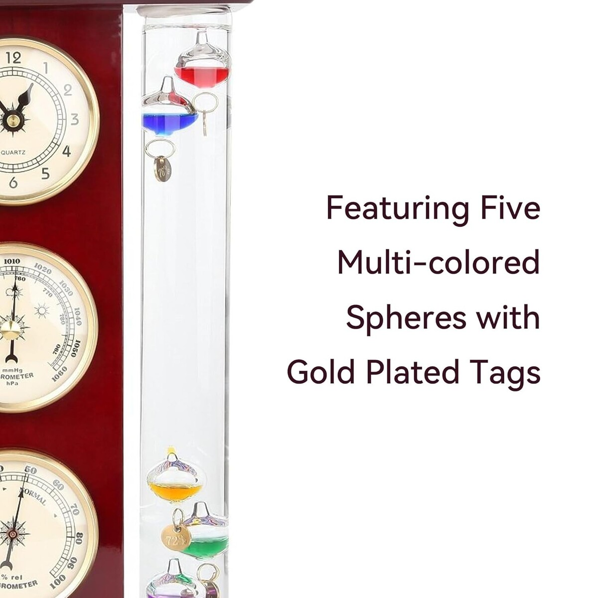Features: Clock,Galileo Thermometer,Precision Quartz Clock,Analog Barometer,Hygrometer