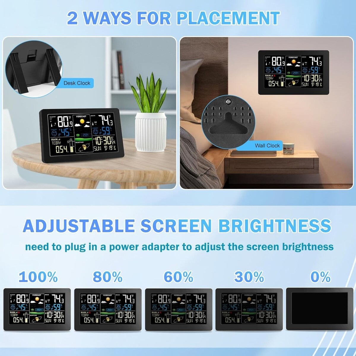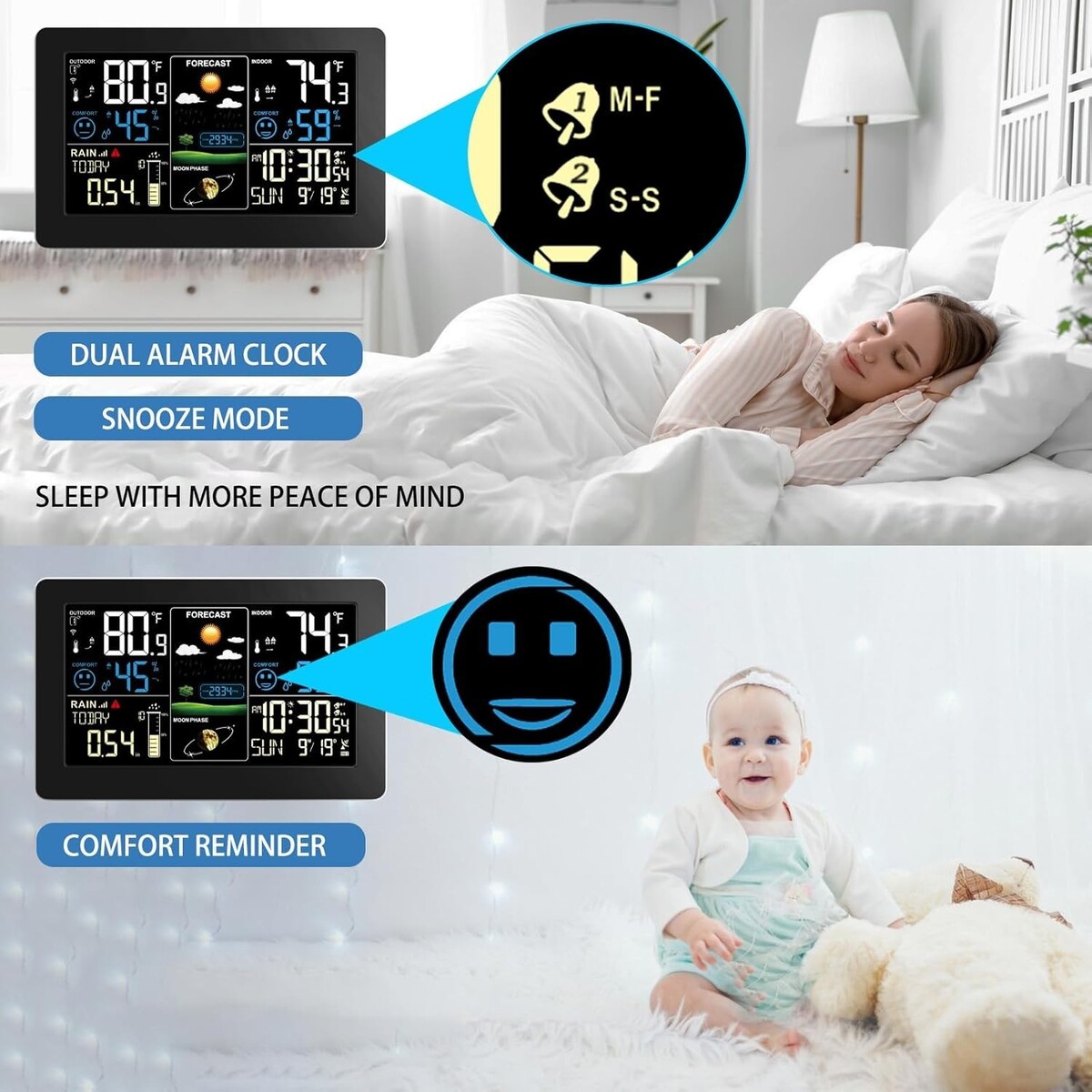 Features: Custom Alerts,Weather Forecast,Wireless,Dual Alarm Clock,Adjustable Brightness,Large Display,Snooze Function,Moon Phase Display,Trend Tracking,Outdoor Index Monitoring