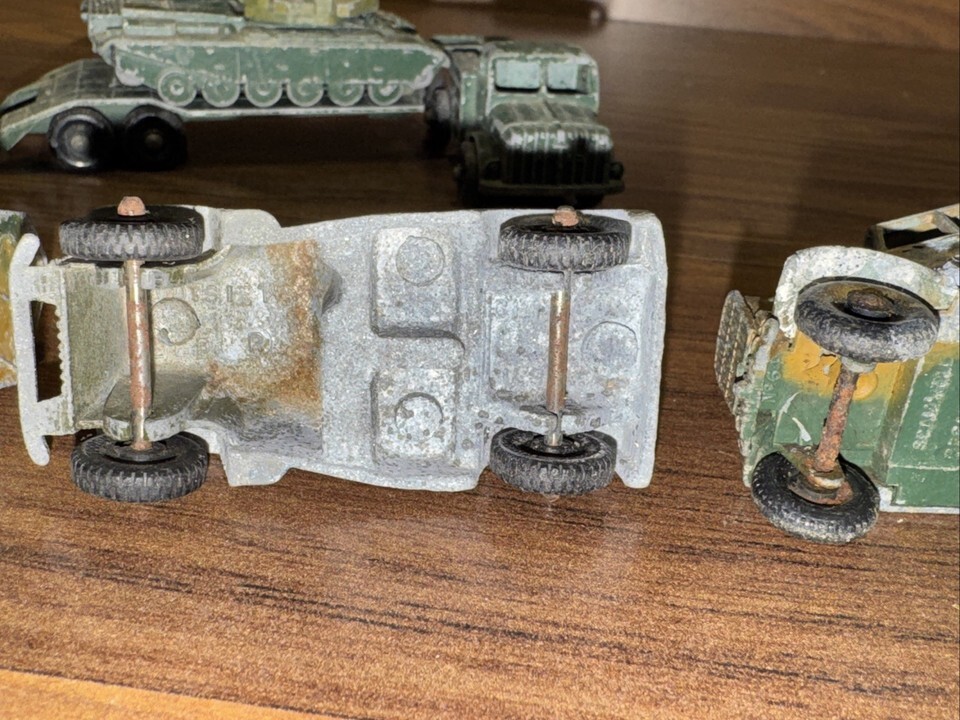 This has a total of five toys. These are vintage toys. They are all like a pot metal and are definitely used well. Some of the wheels move on all of the machines, but some of them are bent or warped due to heat. Some of the metal seems to be deteriorating due to age. Please look at my photos and ask questions before purchasing.