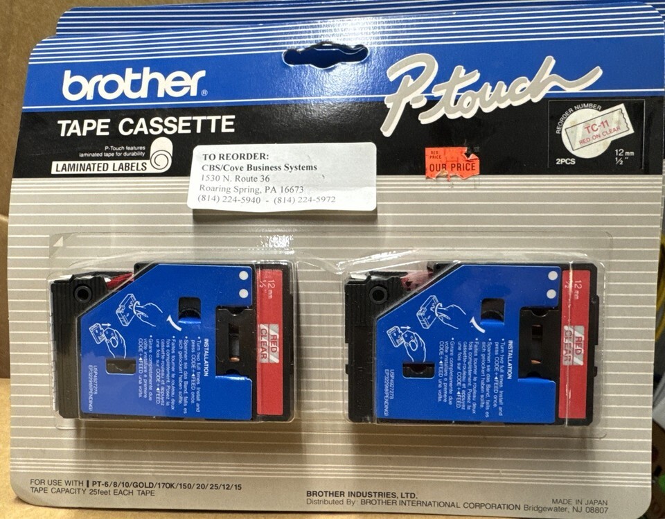 The product is a 2 pack of Brother P-Touch tape cassette laminated labels TC-11, featuring a red color with a clear background. These label tapes are specifically designed for Brother printers using thermal print technology. With a tape width of 0.5 inches, these high-quality labels are suitable for various office and industrial applications, providing both durability and easy visibility. Manufactured in Japan by Brother, these tapes are a reliable choice for creating professional labels efficiently and effectively.