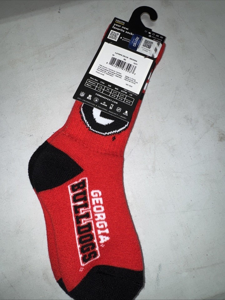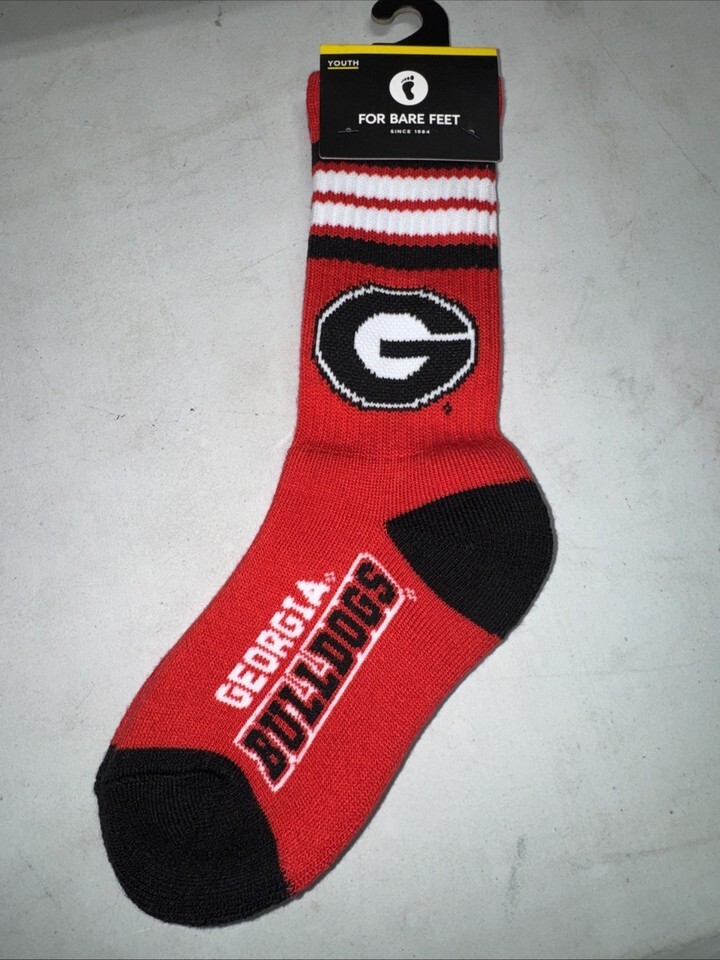 The Georgia Bulldog 4-Stripe Deuce Socks by For Bare Feet are designed for young fans of the football team. These officially licensed socks are in the team colors of red and black, making them a perfect accessory for any Georgia Bulldogs game. Made in China, these youth-sized socks are durable and comfortable for wearing during the regular season games. Show off your team spirit with these stylish and high-quality socks!