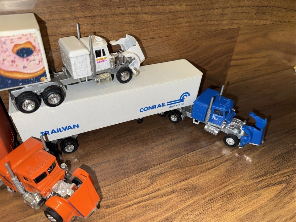 These tractor trailers are very cool looking the design is easily recognizable. Great colors and great themes. Hoods flip up all smoke stacks are in place as well as air cleaners. All wheels move freely and rolls smoothly. Would be a great addition to a train set or just to have up on the shelf. These items do show somewhere if you look at the gas tanks in the pictures, you?ll see the tarnish where the chrome has come off of the tanks. It is just chrome paint. These are 12 inches long and are pretty interesting. Please look at my photos and ask questions before purchasing.