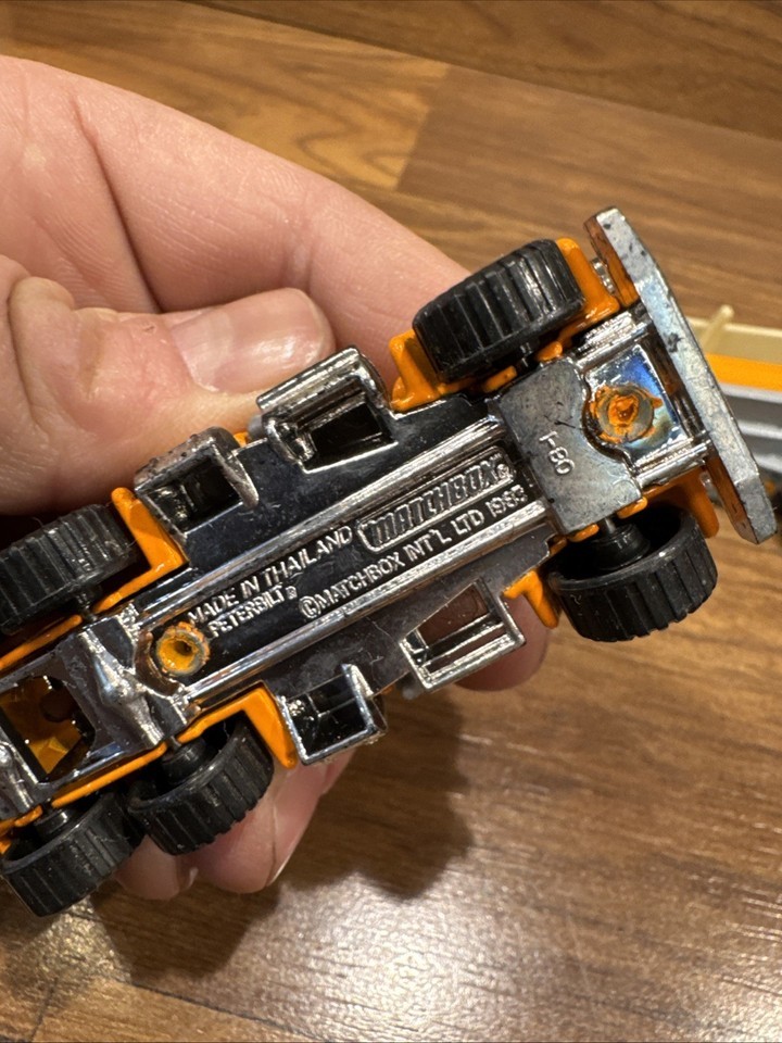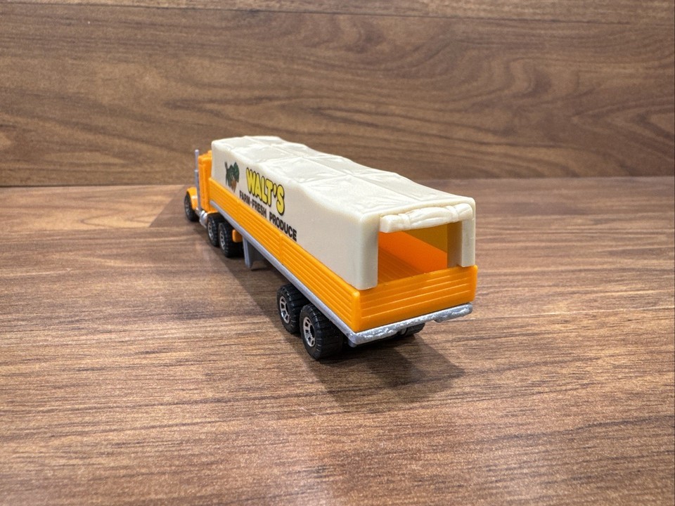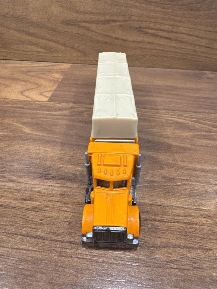 The product is a vintage 1983 Matchbox Peterbilt semi truck/trailer in 1:97 scale. Made of diecast material and painted in orange, this collectible toy vehicle is a replica of a Peterbilt tractor trailer. Manufactured in Thailand, this toy is a valuable addition to any vintage diecast and toy vehicle collection, particularly for fans of Matchbox vehicles.