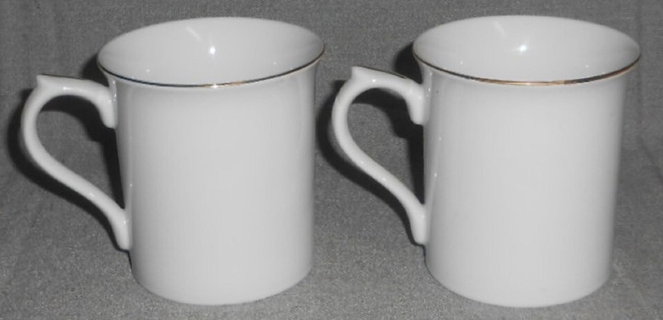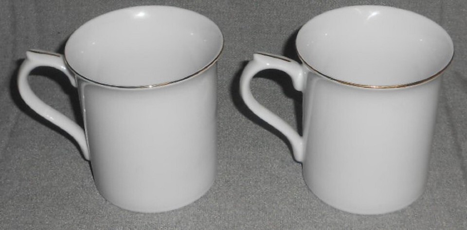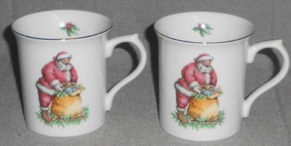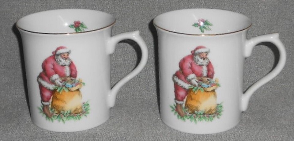 This is a set of (2) 3 1/2" Tall 9 oz Handled Mugs w/Gold Trim from 1992 Macy's and The Cellar in the Santa Christmas - Holiday Pattern. Both are in good pre-owned condition with no chips or damage.