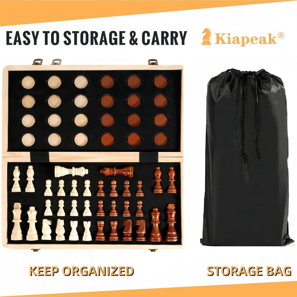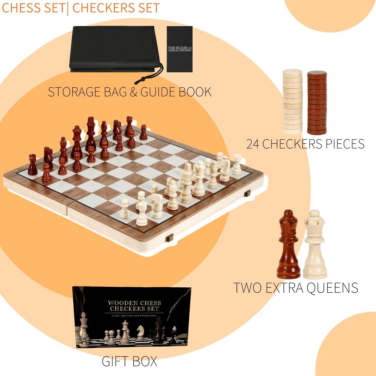 ?High-Quality Excellent Crafts? - Our Wooden Chess Board Made of pine and walnut wood materials, After we finishing and polishing , our chess board has a smooth surface, with no rough edges or splinters. Durable, Good Look and Good Touch?,?Chess Borad Size?-Each chess is designed by our engineers, good size and easy to grasp, perfect for kids and adults.The board Size is 15 '' x 15 '', and each square 1.61 inches in dimension. According standard tournament size chess board to scaled down in proportion, Very Practical and Easy to carry.,?Portable and Easy to Store ? - The wooden chess board is designed to be foldable, and the pieces can be securely tightly held inside the box by foam, No chaotic and noisy. The Folding size is similar to 2 books size, its compact size makes it easy to fit in a backpack, perfect for Travel and School Playing.,?Checkers Board Game ? -In addition to the chess pieces, our chess set also includes an additional 24 pieces for playing the Checkers Board Game. Checkers is a strategic game, help you to train planning and tactical thinking. It's a game enjoyed by all ages players.(Checkers are not magnetic),?Great Gift for Kids and Adults ? - Our Magnetic Chess Set is an ideal gift for various occasions such as birthdays, holidays like Christmas, Thanksgiving, Anniversaries, Children's Day . Whether you're a beginner or a seasoned player, this chess set is suitable for all skill levels, Good choice for casual play or professional tournaments.