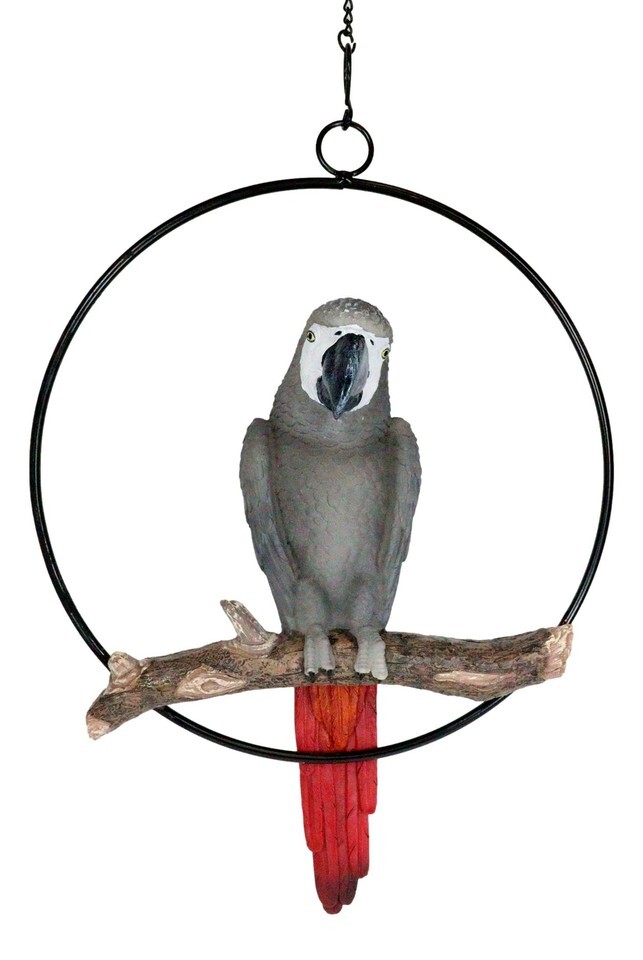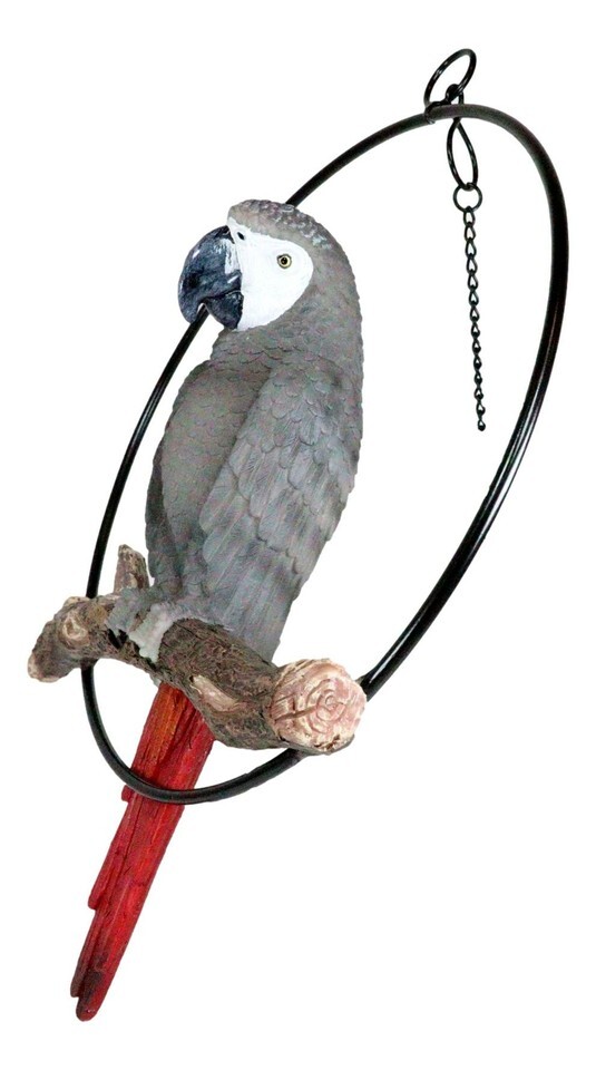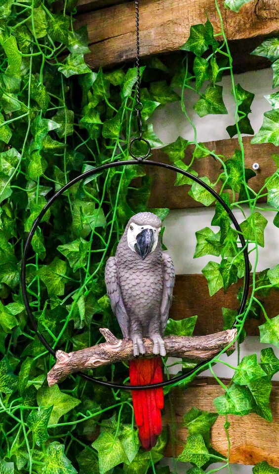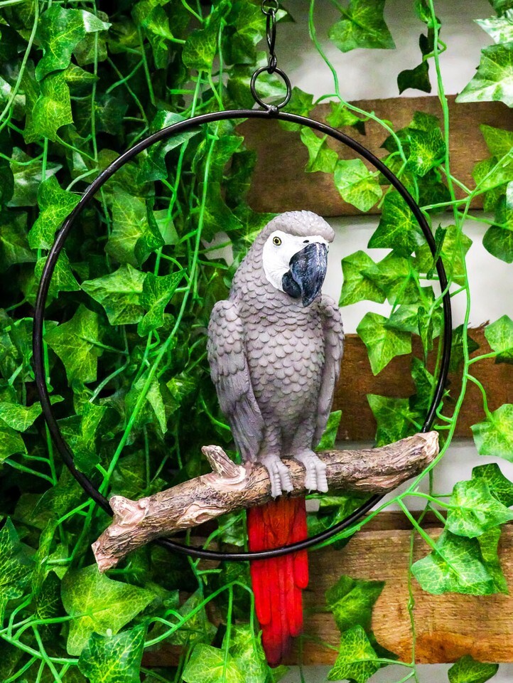 Hanging Congo African Grey Parrot Perching On Branch With Metal Ring 13.5" H