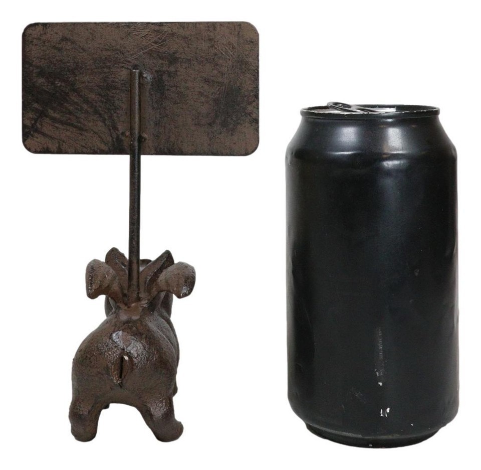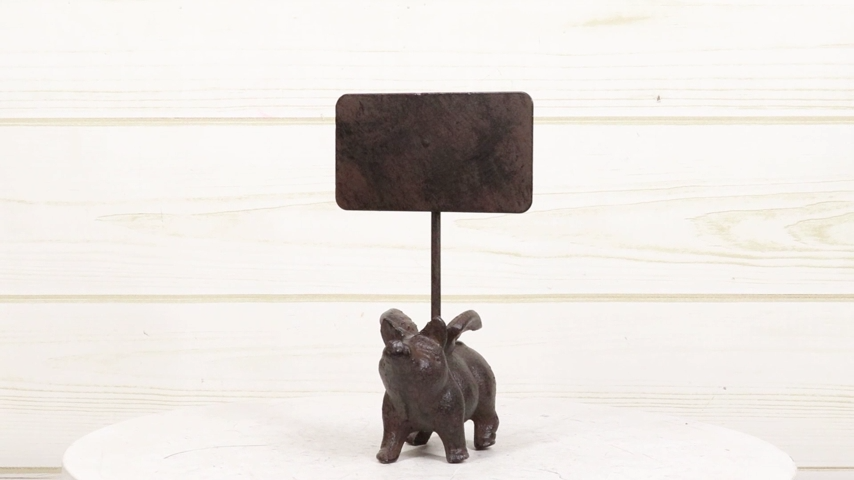 ? This flying pig with chalkboard plank sign is made of cast iron, hand painted and polished in rust bronze finish.