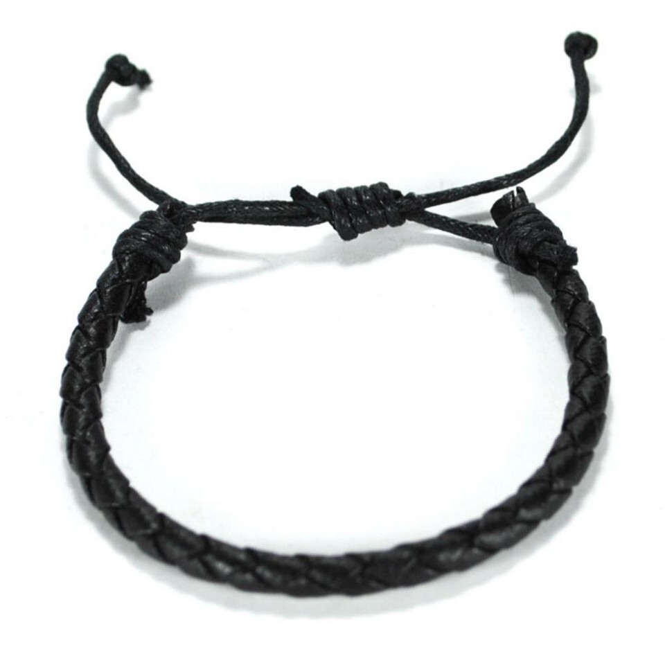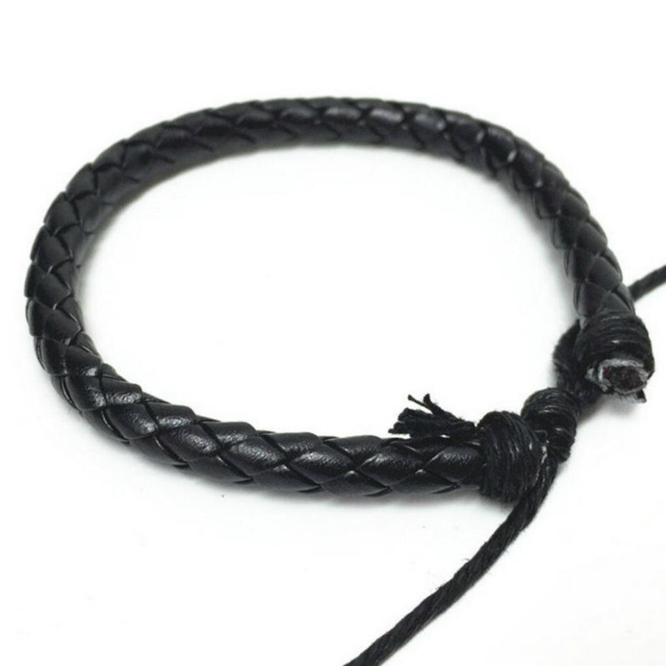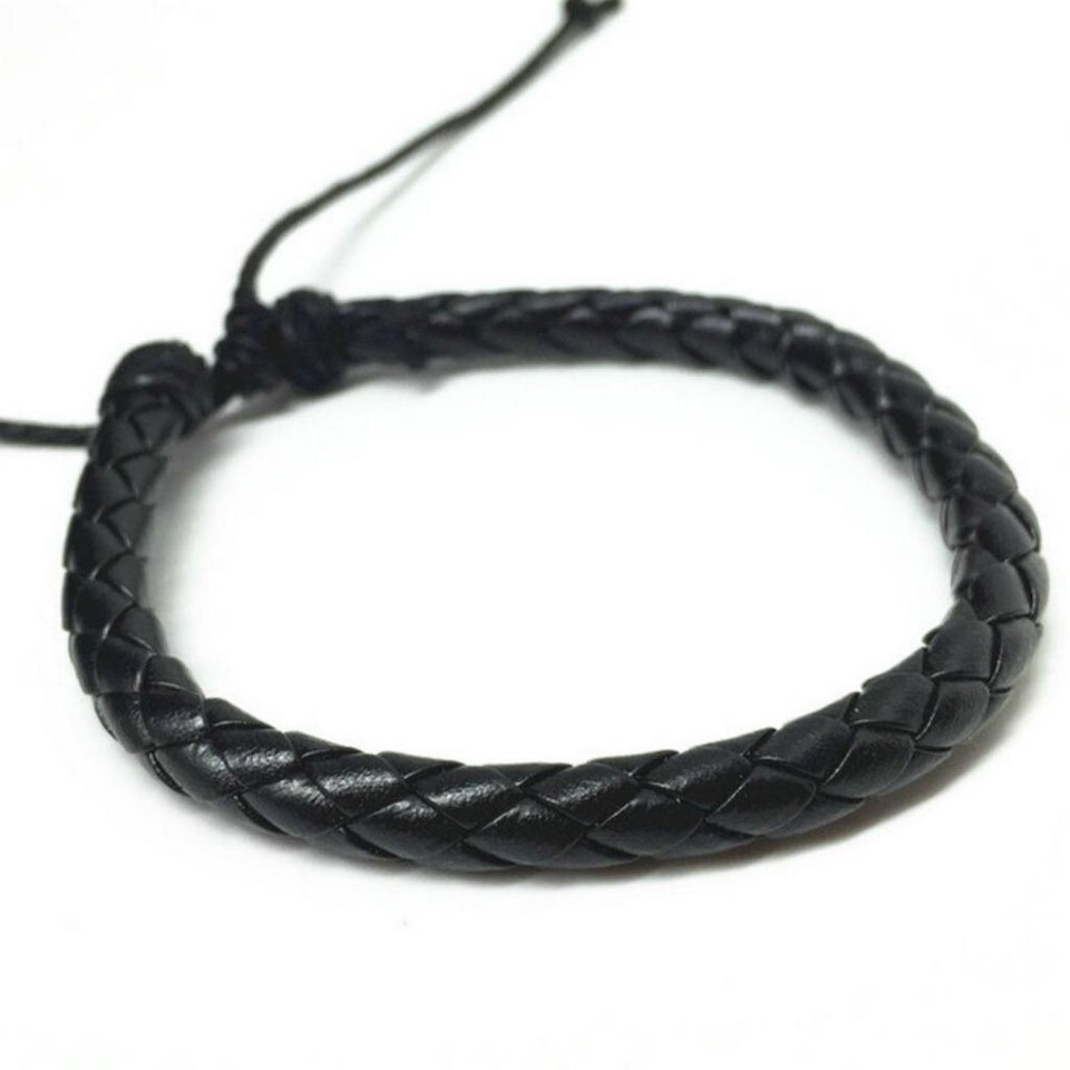 This adjustable, 'one size fits all' bracelet is made from 3/16" diameter braided faux black leather cord.
