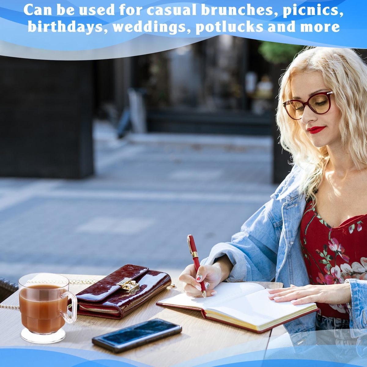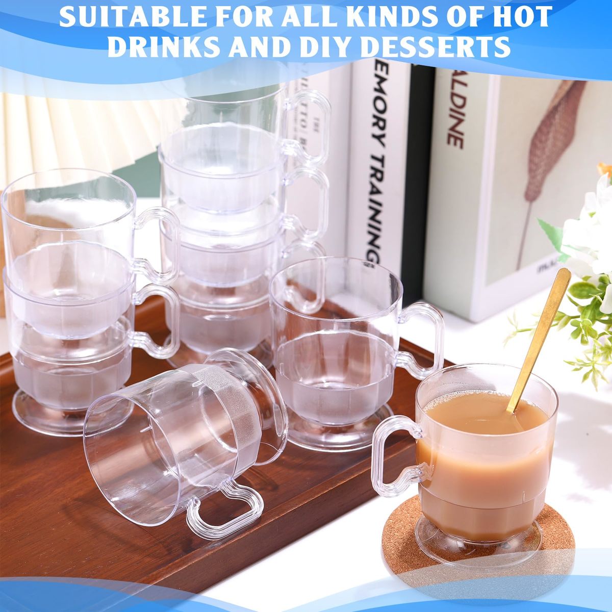 Sufficient Quantity: package includes 50 pieces of disposable plastic tea cups with handles; Abundant quantity to meet your multiple parties or catering events demands; You can also give them to relatives and friends who run restaurants,Disposable or Reusable: the disposable clear mugs is made of quality plastic, not easy to deform, and does not contain BPA, non toxic and reliable, safe to use, can be applied as a disposable tea cup, and you can wash it if you don't mind it, for repeated use; Note: not suitable for dishwasher,With Handle and Foot Base: the plastic coffee cup is designed with a handle and a stable foot base; When holding hot or cold drinks, keep your fingers from being exposed to hot or cold temperatures; The design of the foot base can be placed on the table smoothly to prevent dumping,Ideal for Catering: clear plastic coffee cups with handles can be applied for tea, coffee, cappuccino, latte, creative desserts, DIY, etc.; They are suitable for coffee shops, luncheons, dessert DIY shops, snack bars, restaurants, hotels and other catering outlets, and are ideal for catering ideal for shop,Wide Applications: disposable mugs with handles can be widely applied in our daily life, suitable for birthday party, wedding, baby shower, bridal shower, Thanksgiving, family gathering, Christmas, luncheons, buffets, picnics, casual brunch, dinner parties and more