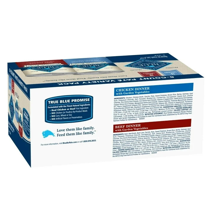 REAL MEAT FIRST: This dog food is made with real, high-quality variety pack featuring Chicken and Beef as the #1 ingredient | PACKED WITH FLAVOR AND NUTRITION: This adult wet dog food is made with the finest natural ingredients and enhanced with vitamins and minerals for overall health to help your adult dog thrive and maintain a healthy coat | FEED THREE WAYS: Mix this wet dog food into dry dog food, serve alone for a complete and balanced meal, or give as a tasty treat between meals | HEALTHY, WHOLESOME INGREDIENTS: This wet dog food is made with no chicken (or poultry) by-product meals and no corn, wheat, or soy | Contains: Six (6) 12.5-oz cans of BLUE Homestyle Natural Adult Wet Dog Food, Chicken and Beef Dinner Variety Pack (3 of Each) | ENHANCED IMAGERY: We have enhanced our digital product packaging to highlight our products? ingredients and essential benefits; while the physical packaging will differ slightly, all information is accurate
