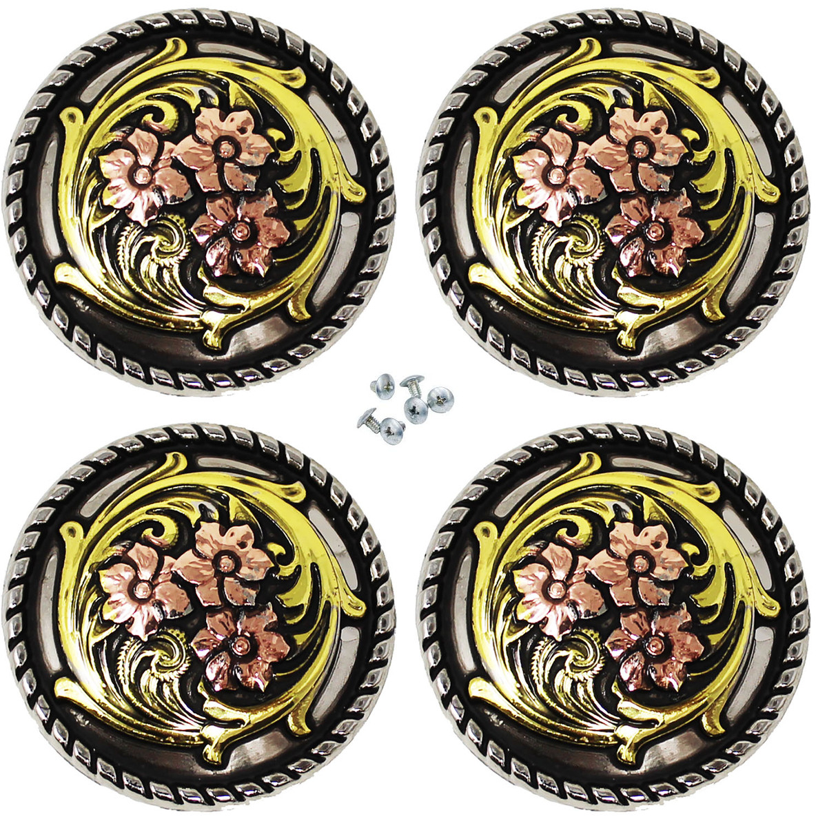 Set of 4 screw back three-tone conchos. Conchos are accented with a copper and brass floral engraving. They measures 1 1/4" (32 mm) in diameter. Easy to install with chicago screws included. Beautifully accents any tack, saddle, belt, or bag. Great for any accessorizing projects or DIY leather crafting.