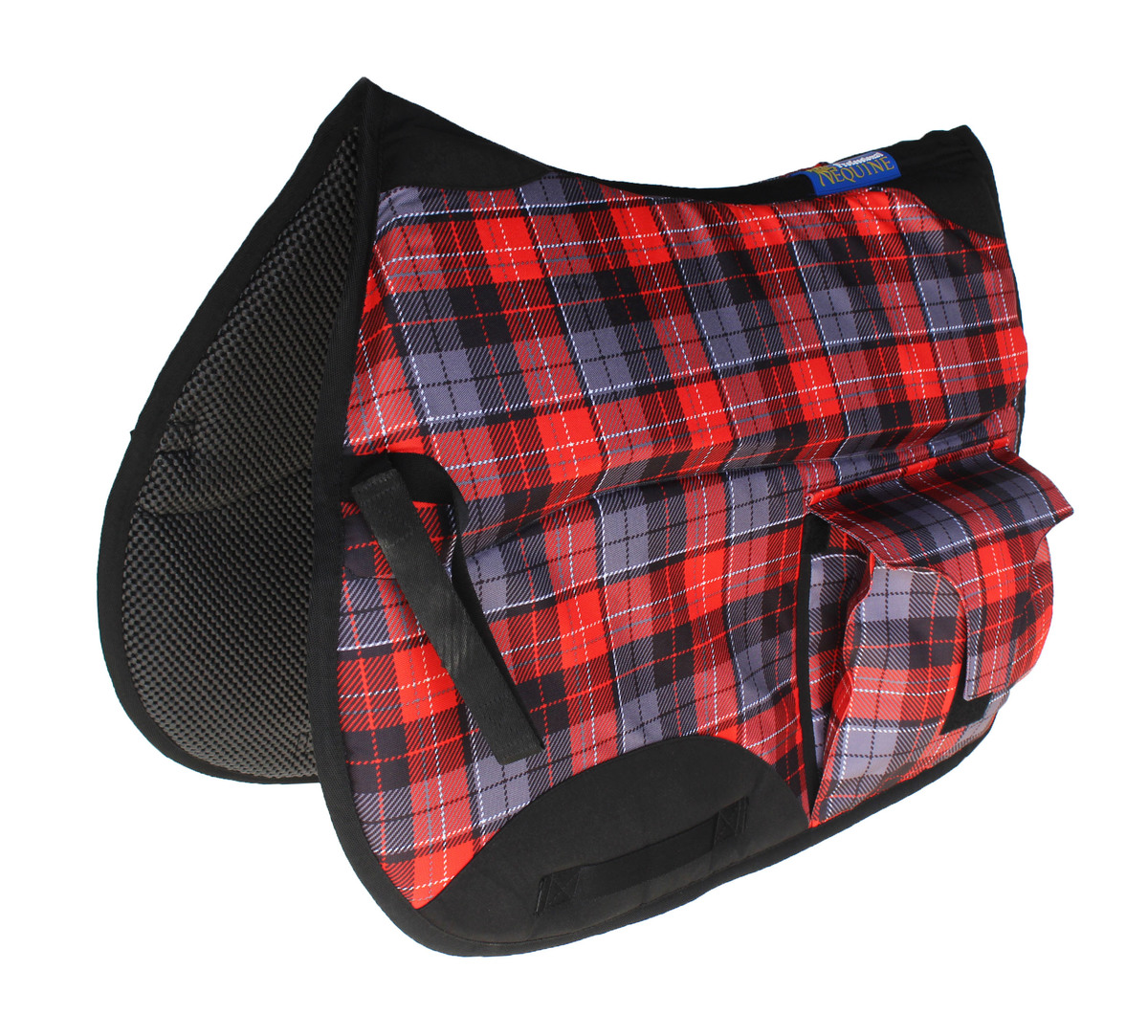 Classic all-purpose contoured pad comes accented with a unique plaid printed upper. Neoprene bottom that helps prevent slippage while promoting air circulation to wick away sweat from the horse's back. Inside the pad is lightweight, superior cushion support for maximum comfort. Velcro closure pockets on each side allow you to carry all essentials and easily access them while on a trail ride. Pockets measure 8-3/4" w x 8-1/2" deep providing plenty of room to store your items. Features durable nylon girth and billet straps. Pad measures 23" on the spine and has a 19" drop.