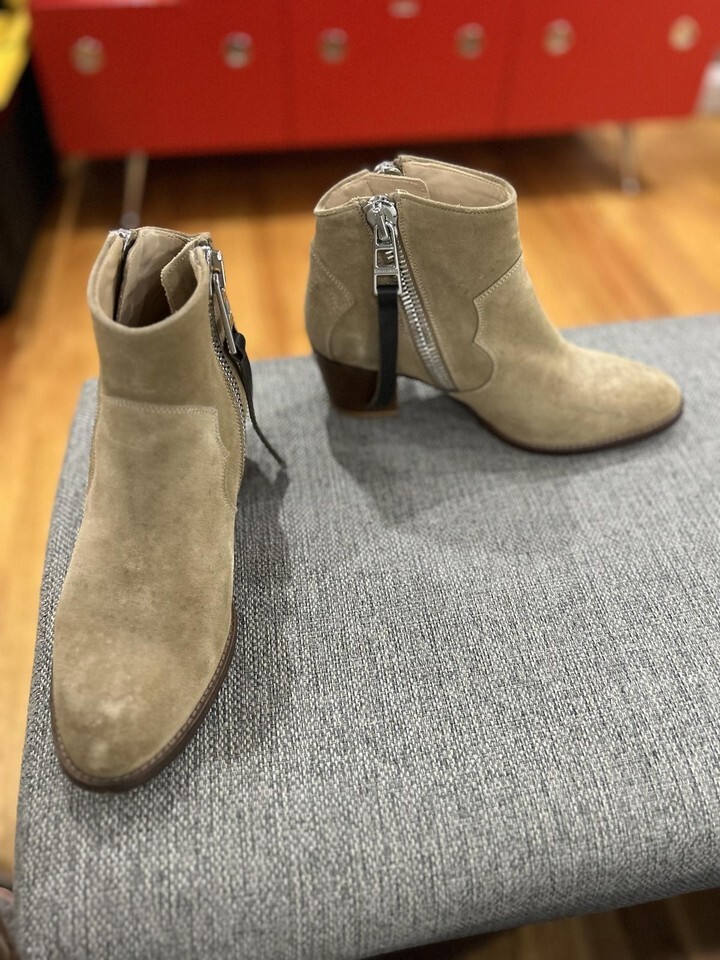 These tan suede ankle boots feature a stylish side zipper for easy wear and a comfortable low heel. The boots have a smooth suede upper with a slightly pointed toe, making them versatile for casual or dressy occasions. The neutral tan color complements various outfits.