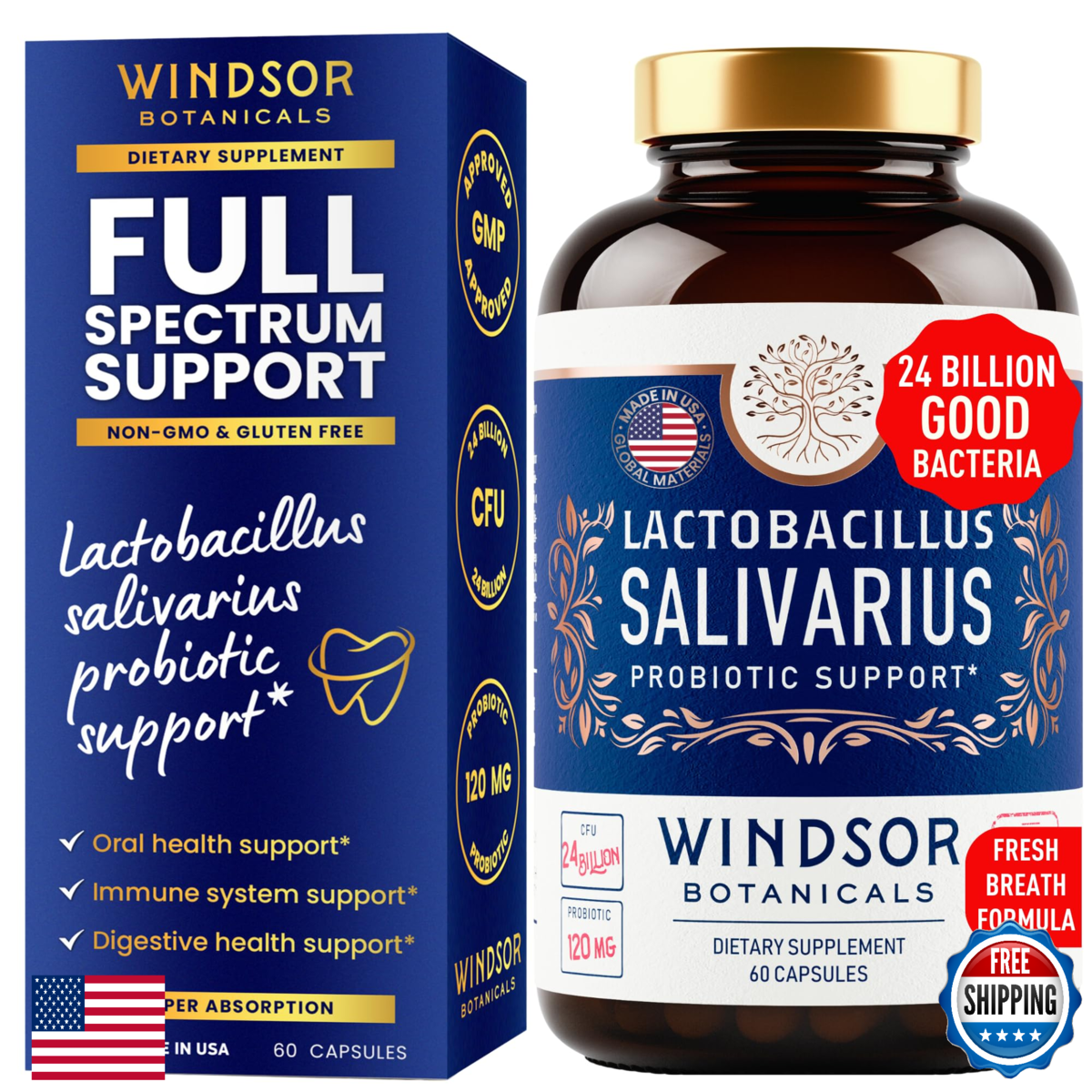 POWERFUL ALL-ROUND PROBIOTIC SUPPORT. Expertly crafted for a balanced microbiome. Regular use may fight bad breath halitosis, support oral health, gut and digestive health and offer immune support.,LACTOBACILLUS SALIVARIUS dental probiotics for teeth and gums formulated with 24 bn CFU Lactobacillus Salivarius, a probiotic strain known for its oral health benefits. Promotes teeth and gums health.,GUT HEALTH SUPPLEMENTS. In addition to oral health, our probiotics also support gut health for women and men. They can help balance good bacteria, gut flora, digestive health, vaginal health, and overall gut health.,IMMUNE SUPPORT. Our Lactobacillus Salivarius capsules also contribute to immune health. A healthy gut is linked to immune support, making this lactobacillus supplement a simple, convenient choice,MADE WITH LOVE IN THE USA with premium global materials. Expertly formulated lactobacillus salivarius oral probiotics, gut cleanse capsules. With vegetarian, non-GMO and gluten-free ingredients.