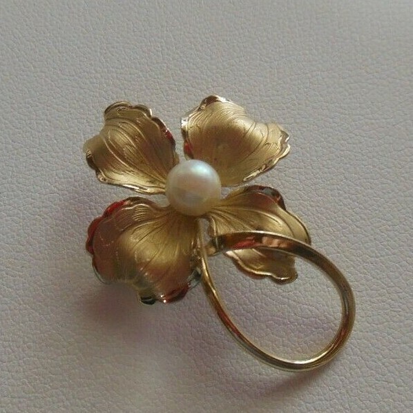 Vintage Signed WELLS 12K GF 4-Leaf Flower Pearl Brooch W/ Logo on back
