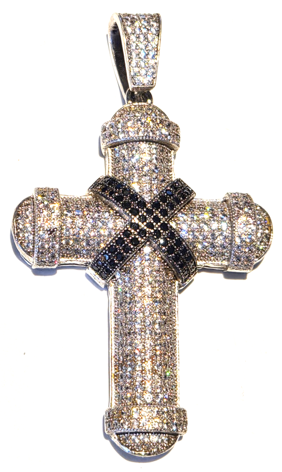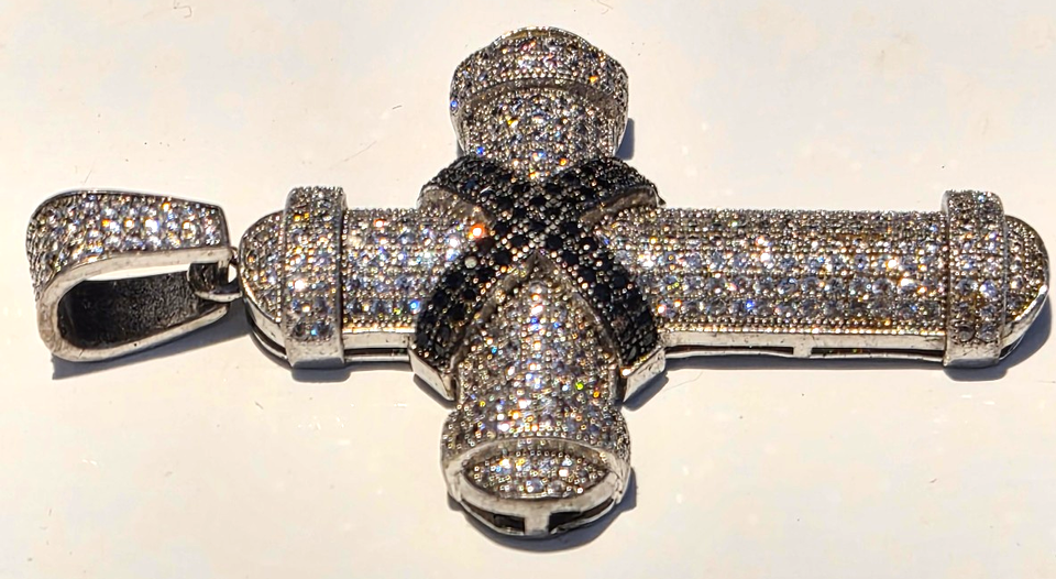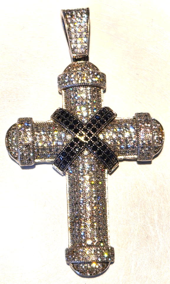 Authenticity Guarantee 925 Silver & Pave Black & White Moissanite Cross Pend...