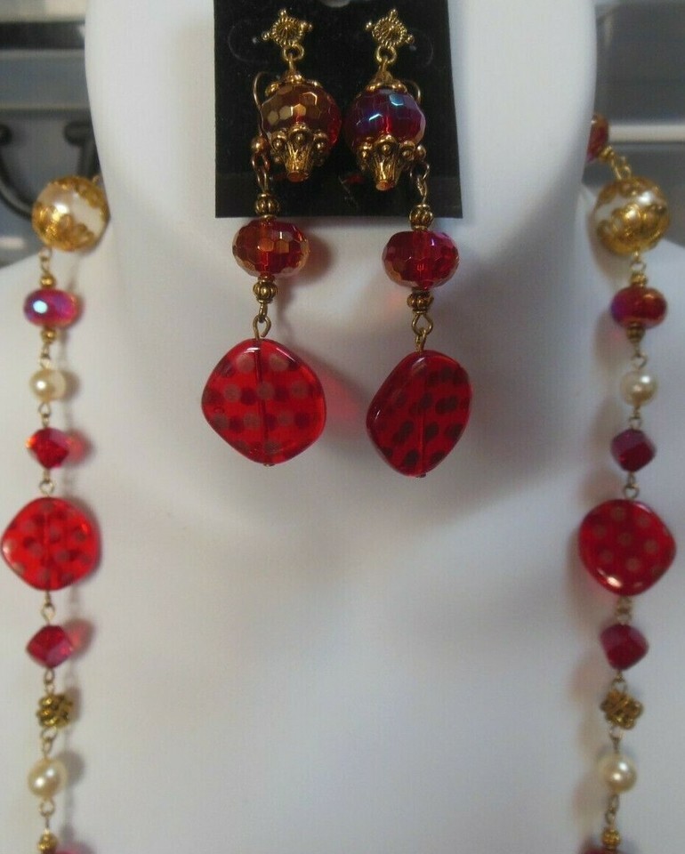 Vintage Long Gold-tone End-cap Red Glass Faux Peal Necklace Earrings