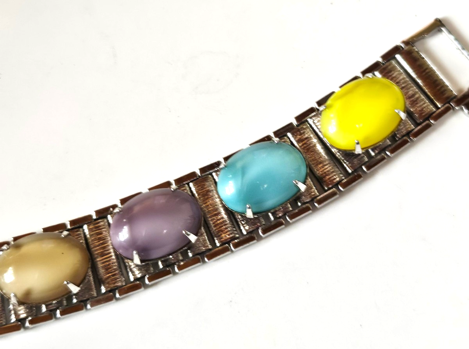 This Vintage Sarah Coventry Multi-colored Cabochon Stone Bracelet 7.5" is a beautiful and unique accessory that features a colorful cabochon stone in various hues.