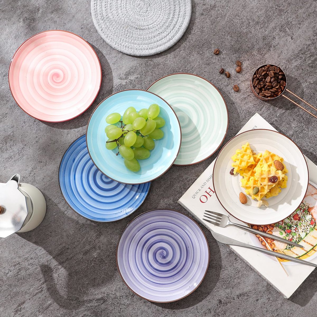 SMALL SIZE BUT VERSATILE DESSERT PLATES - Diameter 6 inches, perfect size for small portions of dessert, appetizers, salads, snacks, chips, pasta, sides, sandwiches, cheese, sushi, fruits, bread, and even for foods with sauce, etc. The slightly raised edges around can keep any sauce from running off.,ENJOY THE JOYFUL COLOR BLACK SPECKS DESIGN - Feature beautiful swirl and black speckles design with bright colors to enhance the aesthetic appeal of your kitchen! These salad plates will make an excellent addition to your table.,STURDY HEALTHY PORCELAIN - Our dinnerware all are fired at high temperatures, making them sturdy and safe to be used in the Dishwasher, Microwave, Oven, and Fridge. They have no harmful lead and cadmium. You can use them with peace of mind and enjoy every meal that belongs to you.,STACKABLE EASY TO CLEAN - These small dessert plates have an efficient stackable ability to save your cabinet space. Its premium glaze can protect the pattern and color well which resists scratches. You can wash them by hand breezily or place them in the dishwasher without color fading,PERFECT PRESENTS - The exquisite design and the shining color are the ideal decoration for dessert, salad, cakes, appetizers, etc. That would be a great present choice for a housewarming, wedding, party, Thanksgiving, Christmas, etc.