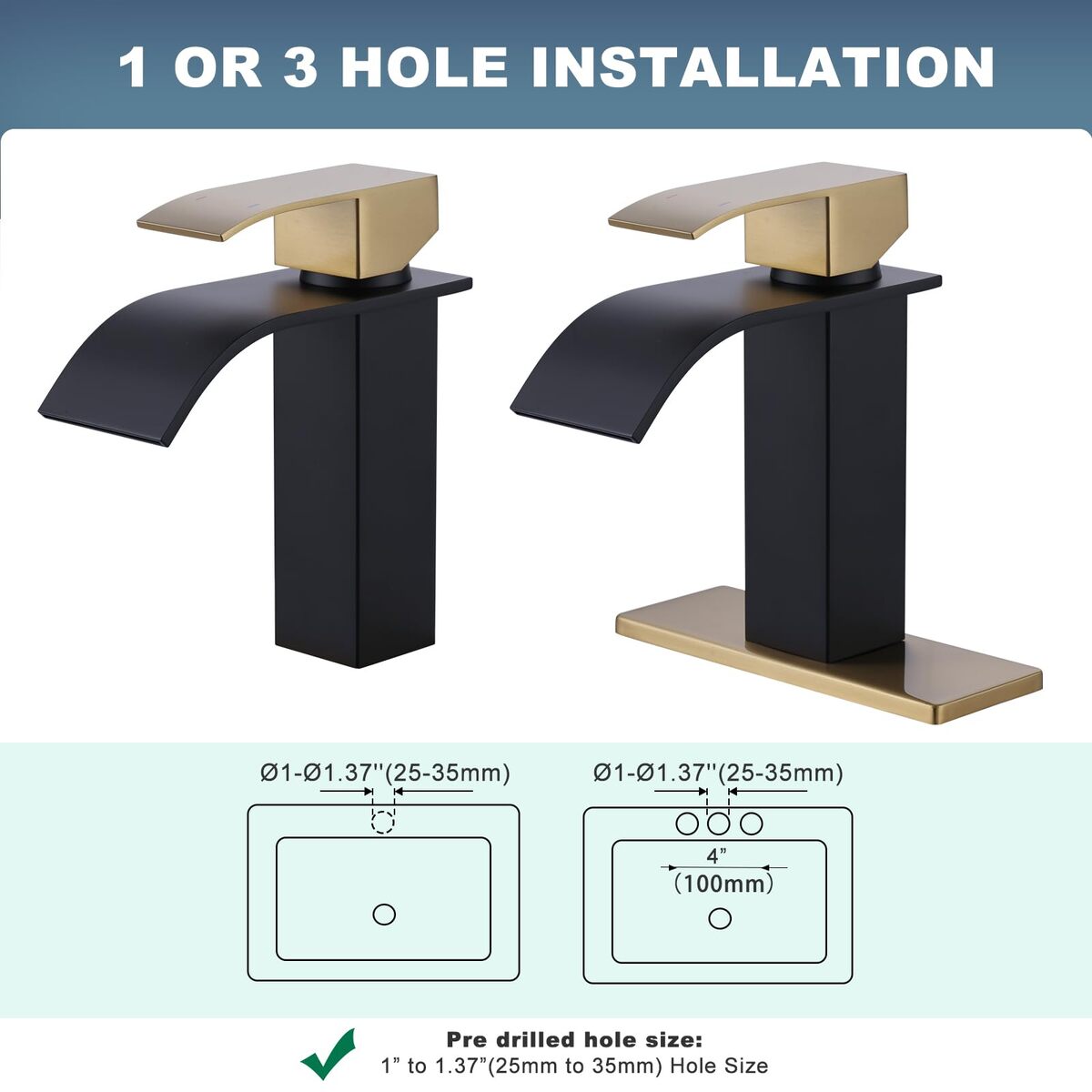 Waterfall Spout Bathroom Faucet - The bathroom faucets provide a beautiful, steady laminar waterfall stream that can make your bathroom adds a touch of transitional elegance. Note: In order to reduce noise, we improved the water outlet. Before installing the faucet, please open the hot and cold angle valve to flush for 30 minutes.,1 Hole or 3 Hole - Designed to fit 1 or 3 hole configurations (hole size: 1"- 1.37"), included 6.3" deck plate for 3 hole centerset installation, cover 2 side holes to make bathroom sink faucet beautiful.,Single Handle Design - Single handle ergonomics design for easy temperature and water flow control. Included 2* 24" cUPC supply hoses standard 3/8" and pop up drain.,Brushed Gold Finish - This waterfall bathroom faucet with black and gold pairs rich, warm tones with lush texturing for a timeless finish.,Sturdy Stainless Steel Material - Our bathroom sink faucet is made of stainless steel for superior rust resistance, durability and safety. The ceramic cartridge reduces leak points, survives 500,000 times open close test.