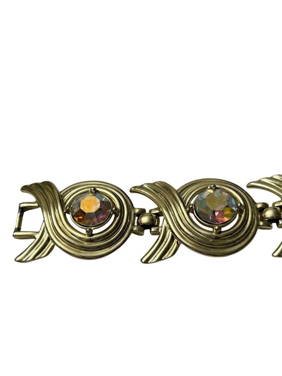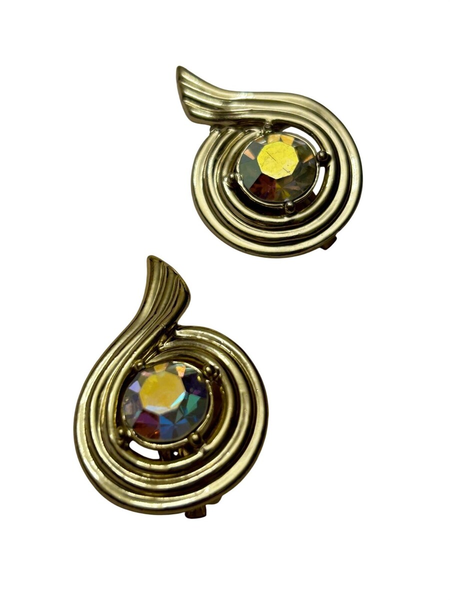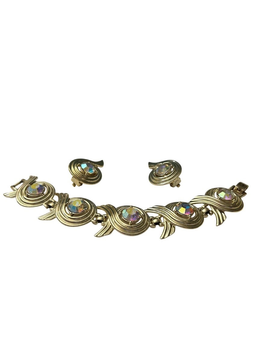 Elegant mid-century jewelry set featuring swirling gold-tone metalwork with iridescent aurora borealis stones, capturing the refined aesthetic of vintage costume jewelry.