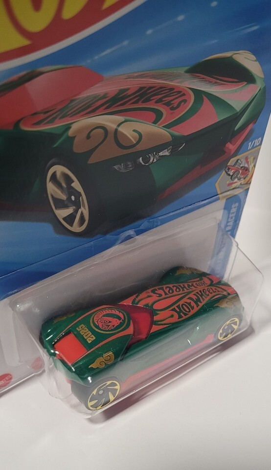 The 2025 Hot Wheels TWIN MILL GEN-E 27/250 from the HW Celebration Racers Series 1/10 is a green and red die-cast metal and plastic car in 1:64 scale. This Hot Wheels model features gold RA spoke wheels and comes in an unopened box, making it a collectible item for boys and girls of all ages. With its unique design and theme from the 2025 Hot Wheels Celebration Racers series, this Twin Mill Gen-E model is sure to delight car enthusiasts of all ages.