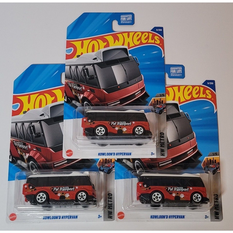Lot of 3 Hot Wheels 2025 Kowloon'd Hypervan in red color from the HW Metro series. This 1:64 scale die-cast van with a case features a 2025 design. Suitable for ages 3 and up, this Hot Wheels model is part of the 6/250 collection, manufactured by Mattel in Malaysia.