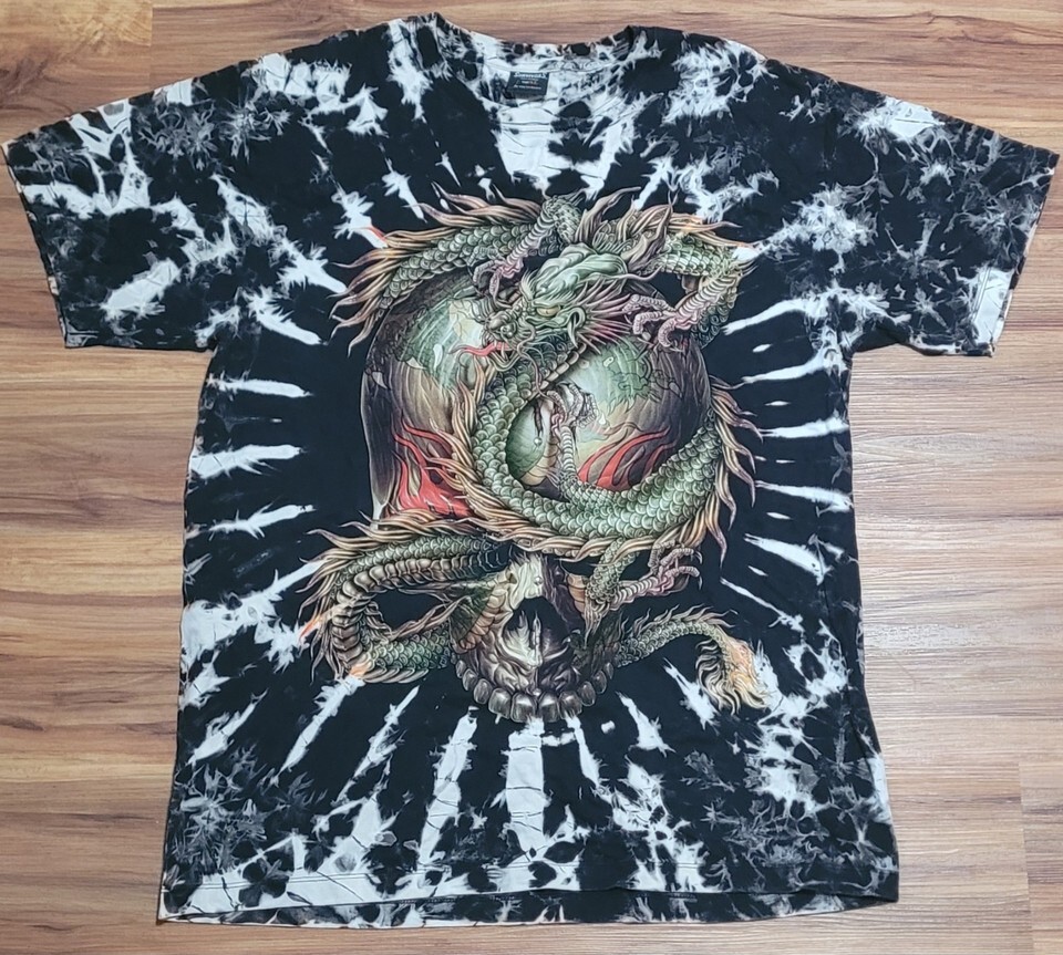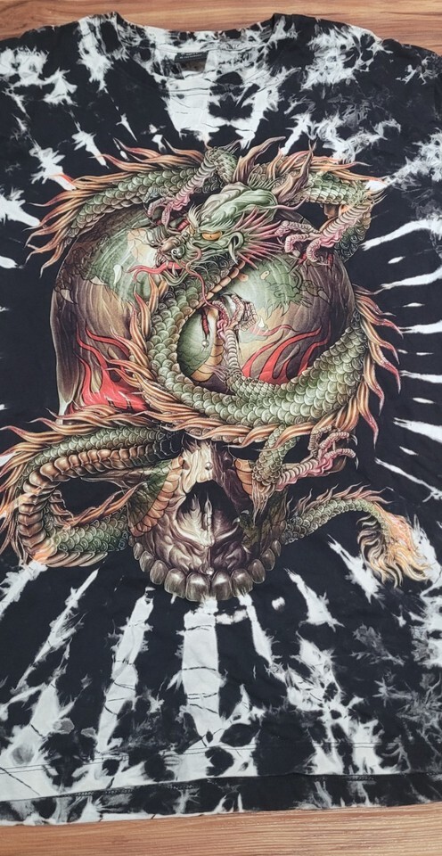 This product is a limited edition black and grey tie-dye t-shirt from the brand Survivors, featuring a graphic print of a skull and a wrapping dragon. The shirt has short sleeves, a crew neckline, and is machine washable. Made from a combination of metal and cotton, it is designed for regular fit in size XL. The shirt is perfect for fans of rock, punk, tie-dye, grunge, and mystical themes, making it a unique and eye-catching addition to any wardrobe.
