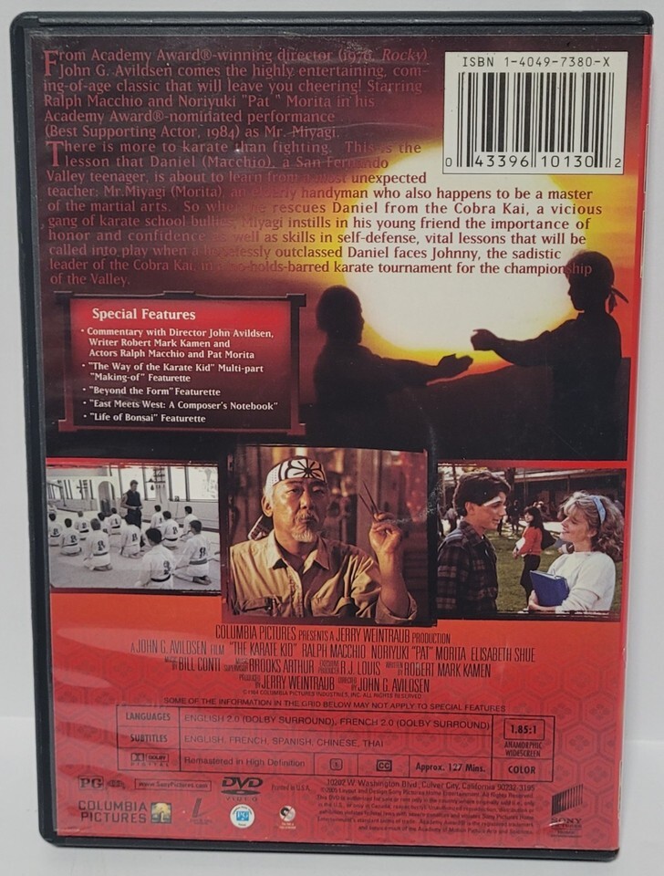 The Karate Kid (DVD, 2005) Special Edition is a family-friendly movie directed by John G. Avildsen and starring Ralph Macchio and Pat Morita. This special edition DVD includes subtitles in multiple languages such as Chinese, English, French, Spanish, and Thai. The film is presented in NTSC video format with a 16:9 aspect ratio, and has a run time of 127 minutes. The DVD comes in a tall/DVD case and carries a PG rating, making it suitable for a wide audience to enjoy the drama and heartwarming story of this classic 1984 film.
