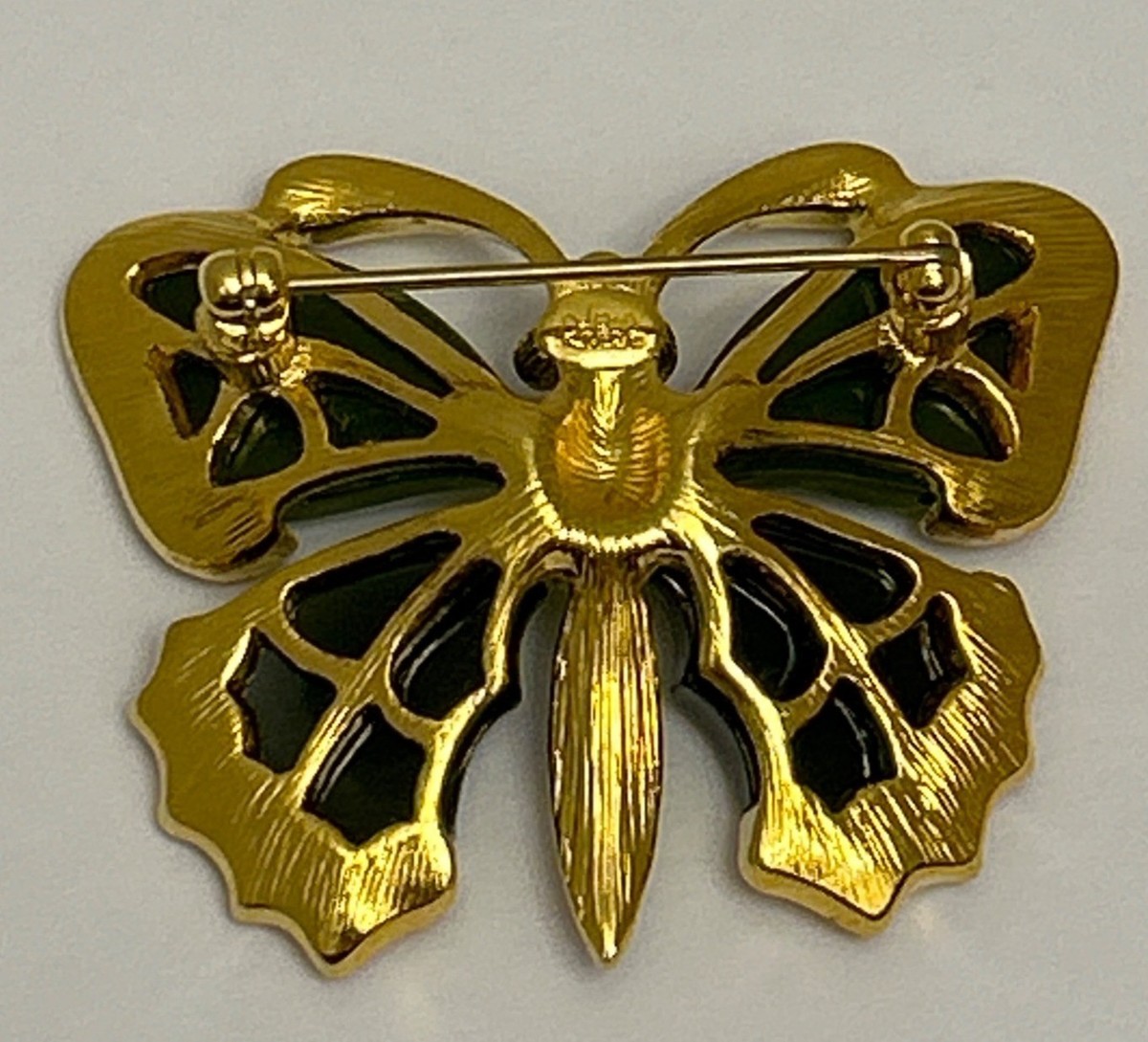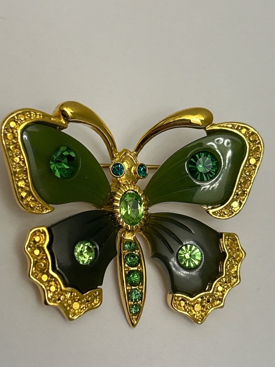This elegant butterfly brooch is part of the Joan Rivers' Bejeweled Butterflies Collection. This pin is #4 of the collection and is called the Jewels of the Far East Butterfly. This piece showcases intricate gold-tone metalwork, deep green faux jade wings, vivid green rhinestone accents on the wings and turquoise rhinestone eyes. The brooch is kept secure while worn via a spring C clasp. This decorative accessory for your clothing, purse, scarf or hair band, is ideal for adding a touch of refinement and color to any outfit regardless of whether your attire is casual, professional or more dressy.
