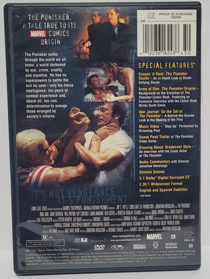"The Punisher" DVD, released in 2004, features Tom Jane and John Travolta in action-packed roles. Directed by Jonathan Hensleigh and produced by Gale Anne Hurd, this R-rated film falls under the Action Adventure genre with a runtime of 122 minutes. Set in English language, the film is sure to entertain fans with its intense plot and stellar performances from the cast.