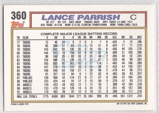 M) 1992 Topps Baseball Trading Card - Lance Parrish #360