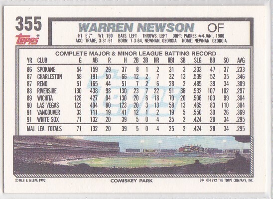 M) 1992 Topps Baseball Trading Card - Warren Newson #355