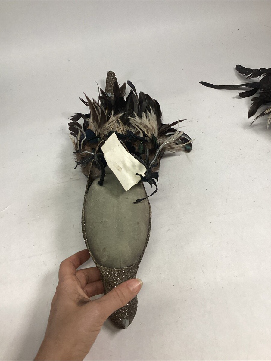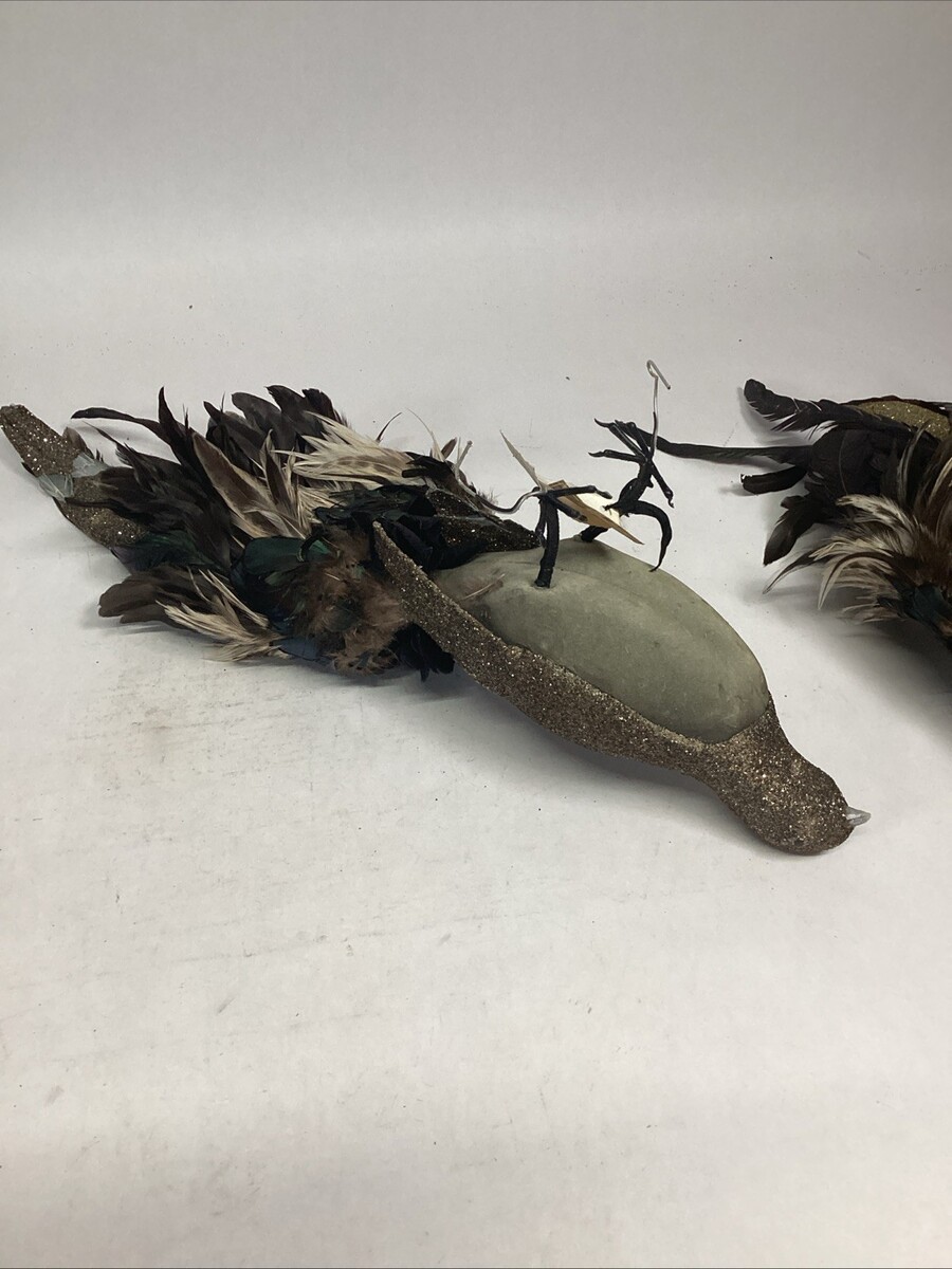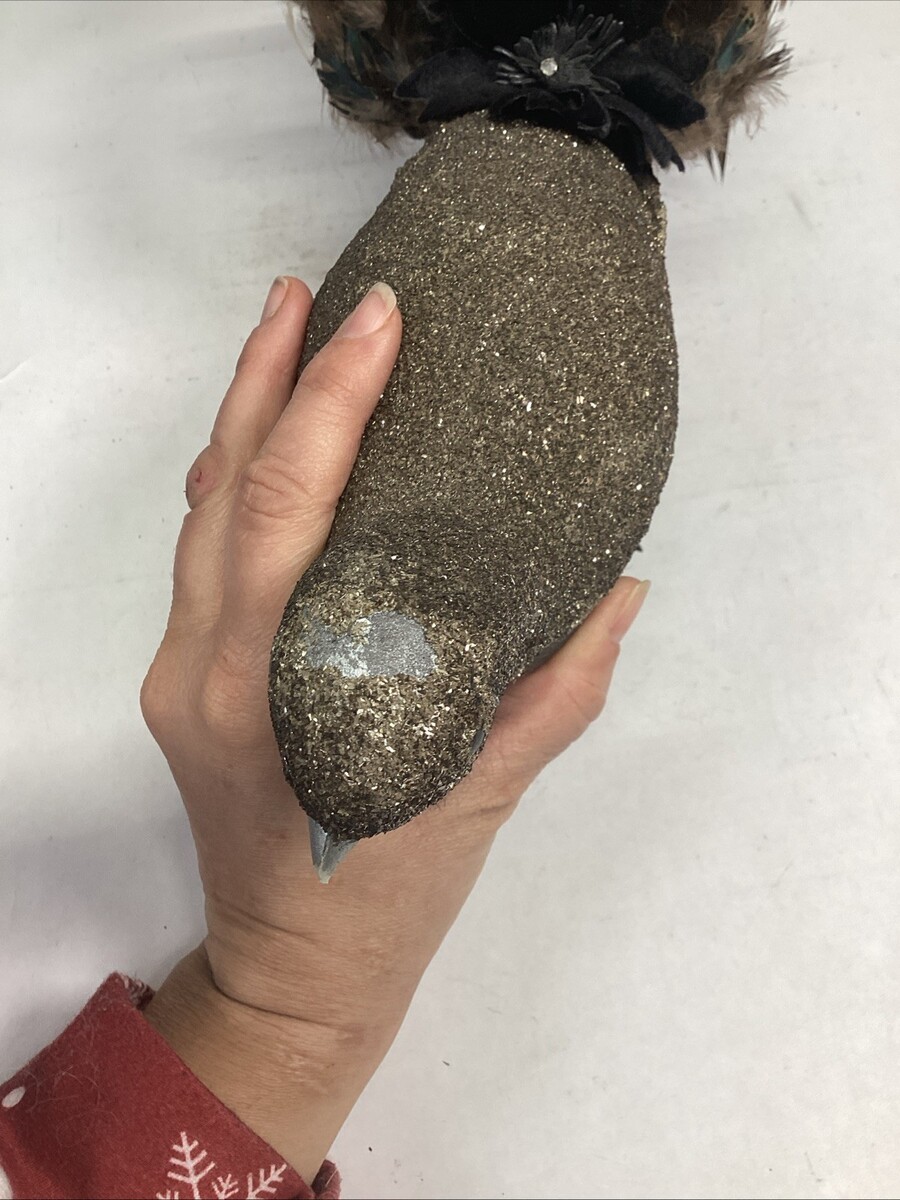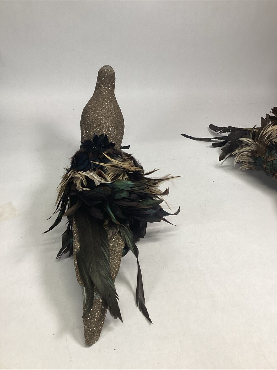 The larger peacock is missing some glitter on the top of its head and in the underbody and the one back wing is a little damaged. This one measures 21?Lx6.5?Wx7.25?H