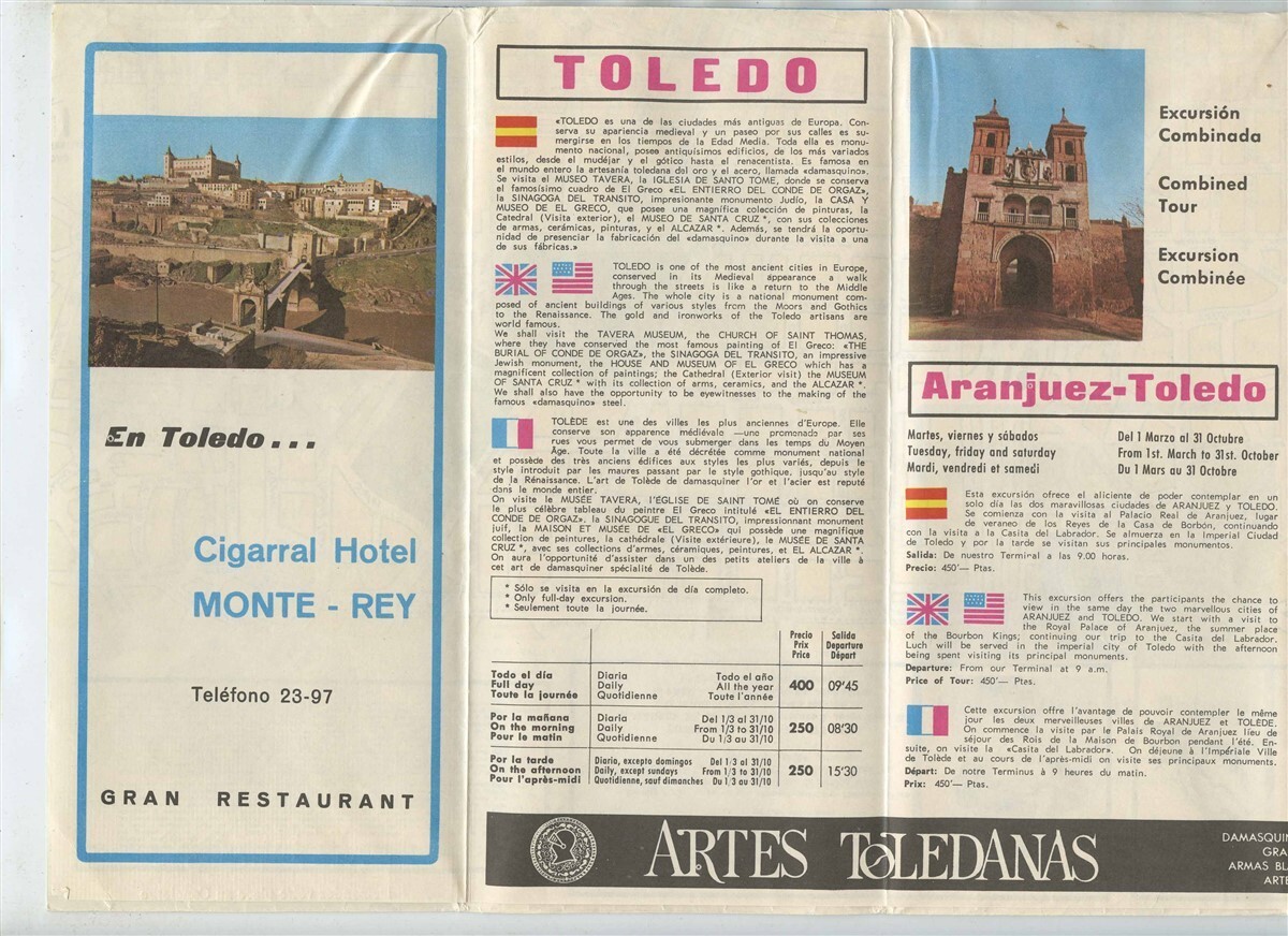 A large well illustrated 30 panel foldout brochure in French, Spanish and English. Has large Madrid Map and tour information on Madrid ,Toledo, Aranjuez and El Escorial . Plus advertising. Priced in Pesetas.