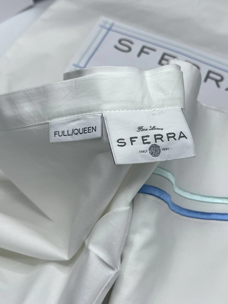 Sferra Tratto White Queen Duvet Blue Double Embroidered Sateen Stripes Italy NEW