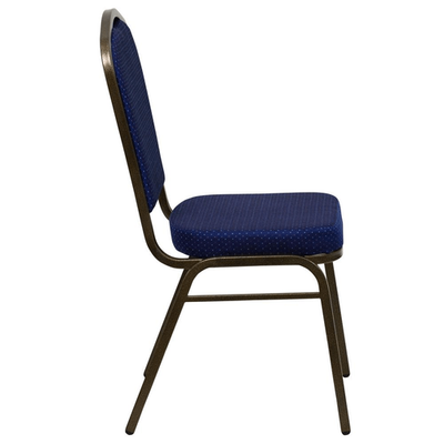 Upgrade your event space with the Elegant Navy Blue Crown Back Stacking Banquet Chair with Gold Vein Frame. This stunning addition to your banquet hall not only delivers style but also exceptional functionality, making it the perfect choice for any commercial setting. Designed to impress clients and guests alike, these banquet chairs are tested to hold up to 500 pounds, ensuring durability for all your events. Use them as-is for a bold statement or enhance them with chair covers for more formal occasions. The elegant design is sure to command attention! Premium Comfort: 2.5" thick cushioned seat made with CAL 117 fire retardant foam. Durable Upholstery: Navy blue patterned fabric with a seamless back panel. Sturdy Frame: Constructed from 16-gauge steel with a gold vein powder coated finish. Added Strength: Double support braces for enhanced durability. Scratch Protection: Bumper guards prevent scratches when stacked (up to 15 high). Floor Protection: Non-marring floor glides keep your floors safe when moving the chair. These stacking chairs are versatile enough for a range of settings, including churches, training rooms, hotels, convention centers, and schools. You can even incorporate them into your home dining area for a chic contrast with your existing decor. Specifications include: Weight Capacity: 500 lbs Stack Capacity: 15 chairs Warranty: Limited lifetime warranty on the frame Add elegance and functionality to your event space with the HERCULES Series Crown Back Stacking Banquet Chair in Navy Blue Patterned Fabric - Gold Vein Frame today! Don?t miss out on this stylish and robust seating solution. Order now and transform your venue!