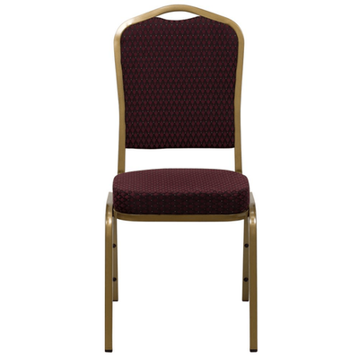 Add a touch of sophistication to your venue with the Elegant Burgundy Crown Back Stacking Banquet Chair with Gold Frame - HERCULES Series. Perfectly designed for commercial use, this chair is not just about looks; it?s built to last. With a remarkable capacity to hold up to 500 pounds, it?s ideal for high-traffic events and functions. Key Features: Burgundy diamond-patterned fabric upholstery with a seamless back panel 2.5" thick seat cushion made from CAL 117 fire retardant foam Robust 16-gauge steel frame with bumper guards to prevent damage when stacked Floor protector plastic glides that safeguard your flooring Limited lifetime warranty on the frame for peace of mind Benefits: Durable upholstery designed for high usage Gracefully angled legs that provide a stylish appearance Double support braces enhance strength and durability Stackable design for effortless storage and transportation Versatile use in commercial or home settings This exquisite banquet chair can stand alone to make a statement or can be elegantly dressed up for formal occasions with a chair cover. Its sturdy construction features a beautifully angled 16-gauge steel frame, ensuring longevity and stability. The cushioned seat, combined with non-marring floor glides, offers comfort and protection, making it perfect for churches, banquet halls, training rooms, hotels, and schools. Transform your seating arrangement with the Elegant Burgundy Crown Back Stacking Banquet Chair with Gold Frame - HERCULES Series. Order now and elevate your event?s ambiance while ensuring durability and style!