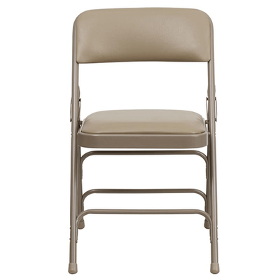 Transform your gathering experience with the 2 Pack HERCULES Series Curved Triple Braced Double Hinged Beige Vinyl Metal Folding Chair. Perfect for hosting family events, from Thanksgiving to summer BBQs, these padded folding chairs eliminate the hassle of "bring your own chair" on your invites! Designed for both commercial and residential use, these heavy-duty metal folding chairs are: Durable: Equipped with an 18-gauge curved steel frame that is triple braced for added support, these chairs can hold up to 300 pounds. Comfortable: Enjoy the plush seating with a 1" thick padded seat featuring CAL 117 foam, ensuring your guests sit comfortably. Versatile: Ideal for use in community centers, events, or your backyard, quickly changing the scenery without sacrificing comfort. Protective: Non-marring floor glides keep your floors scratch-free while you rearrange for the perfect seating arrangement. These chairs come fully assembled, ready to serve as soon as they arrive at your door. Their beige vinyl upholstery and beige powder-coated frame provide a modern yet classic look, making them suitable for any decor. Don?t miss out on elevating your entertaining game! Order your 2 Pack HERCULES Series Curved Triple Braced Double Hinged Beige Vinyl Metal Folding Chair today and ensure comfort and style for every guest!