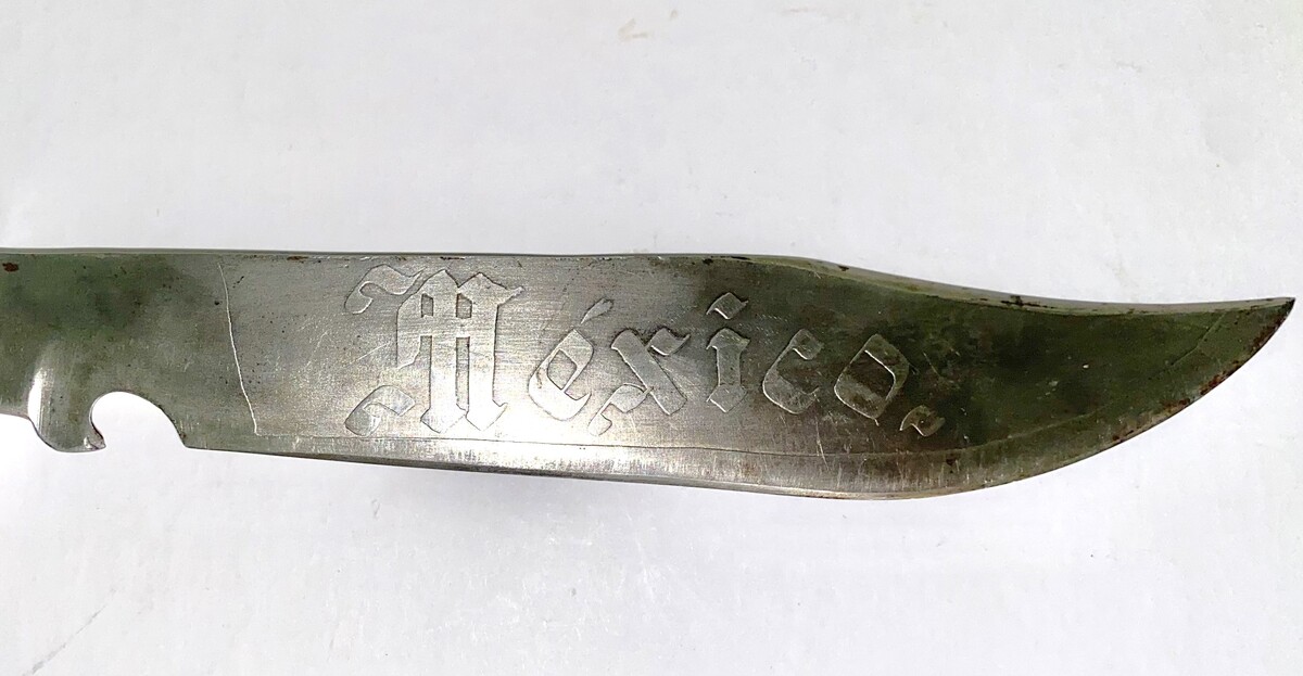Here we have a very rare 1940's Vintage Mexican Snake Hunting Bowie Knife that features a Snake Guard that is eating itself. This Mexican hunting Bowie knife with its snake guard is a very rare knife to find, especially in such exceptional condition. Usually, if you can find these at all, the bullhorn used in the handle are either cracked or missing. This one hasn't any cracks on either side however one side has a couple of tiny chips. Also, the snake guard eating the handle is in good condition as well.. These knives were sold during the 40s and 50s at tourist attractions in Mexico. This one comes complete with its original sheath which has a minor split in it's sewn seam near the bottom.
