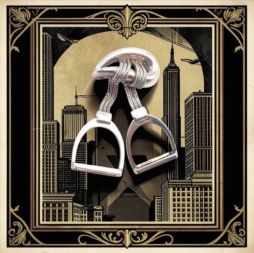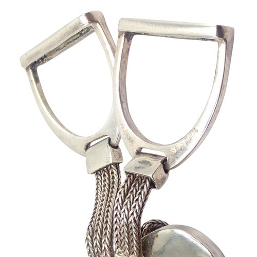 Crafted in solid sterling silver, it features two interlocking stirrup motifs with a polished finish.