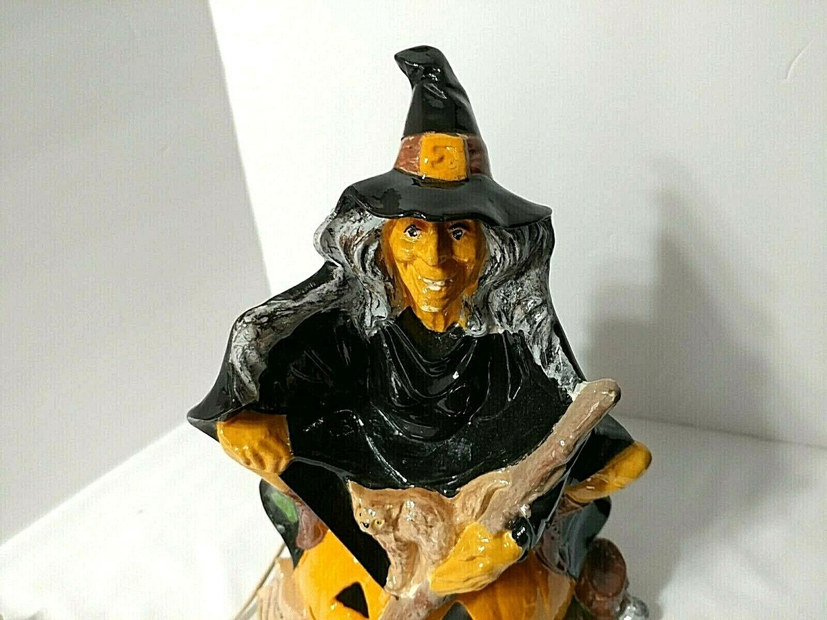 Vtg HALLOWEEN Ceramic WITCH Byron Mold Pumpkin Cat Broom 10.5" Glazed w/ Light
