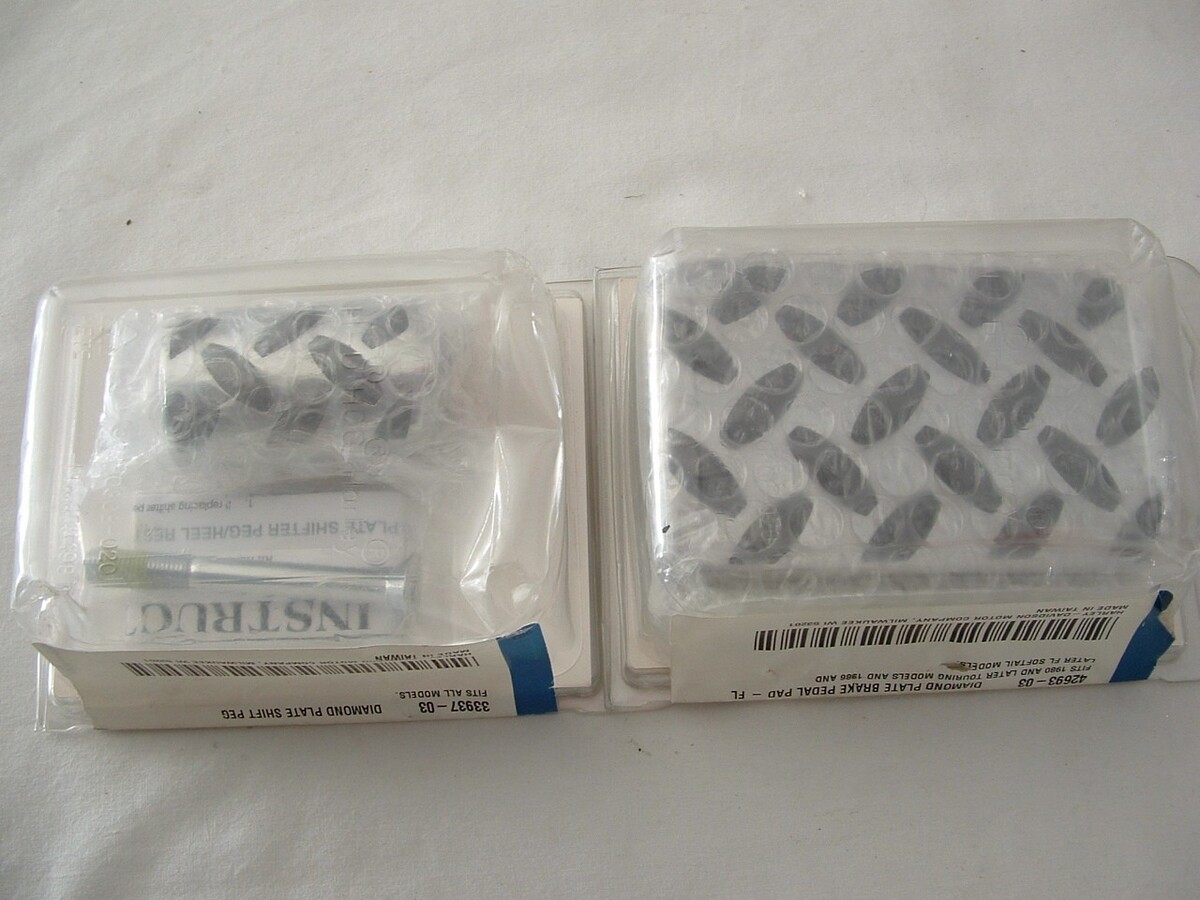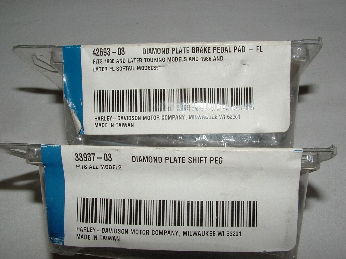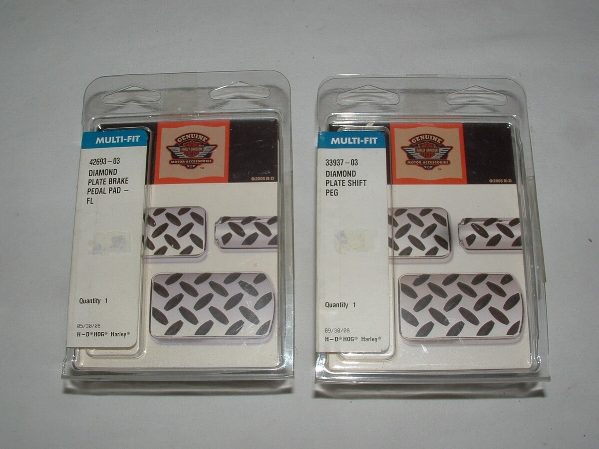 Genuine Harley Davidson - Diamond plate brake pedal pad and shifter peg. Part numbers 42693-03 and 33937-03. These are brand new parts sealed in the factory package. The packages have not been opened. The last picture shows what these parts fit. Before you buy, be sure they will work for you. This sale is for 1 brake pedal pad and 1 shifter peg.