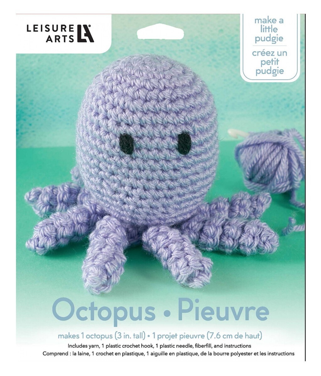 Leisure Arts Olive Octopus Crochet Pudgies Kit 57014. Leisure Arts Crochet Kit Amigurumi Pudgies Olive Octopus. Crochet an adorable, 3 inch tall, round Octopus. Kit Includes: Yarn, 1 Plastic crochet hook, 1 Plastic needle, Fiberfill and Step-by-step instructions. Makes 1 Octopus. Easy skill level. CHK-LAK57014