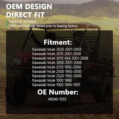 ?Vehicle Fitment?Yezoauto fuel pump compatible with Kawasaki Mule 3020 01-03 / Mule 3010 01-08 / Mule 3010 4X4 01-08 / Mule 3000 01-08 / Mule 2510 92-00 / Mule 2500 92-00 / Mule 2520 92-00 / Mule 1000 88-97 ?Interchange Part Number?OE# 49040-1055 ?Function?The fuel pump is the heart of a vehicles fuel delivery system. Its function is to supply clean pressurized fuel to the fuel injectors. In addition to this, it provides the fuel level reading to the vehicles instrument cluster, shuts off the fuel nozzle when refueling, among many other critical functions ?Installation?1.Compare the replacement pump to the new pump assembly to ensure a match.2.Install the new seal ring and new pump assembly in the tank.3.Using a transmission jack, raise the tank just enough to reconnect the fuel hoses, electrical connections and emissions hoses.4.Reinstall the fuel filler neck and secure it with a clamp.5.Reinstall the fuel tank straps and torque the mounting bolts to the specification listed in the factory repair manual.6.Reconnect the negative battery cable. ?1-year Warranty?Yezoauto is committed to providing better service and products to our customers, we make sure that every assembly line is harshly inspected and 100% tested before assembly to ensure as much as possible that the product will not have problems. If you encounter any problems during the use of the product, please leave us a message, we will give you a satisfactory answer within 18 hours!